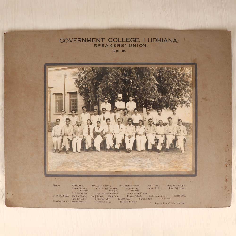Experience a poignant moment in India's history with this evocative vintage black and white photograph. The image captures the Speakers' Union at Government College in Ludhiana, India in 1948-1949. Crisply preserved and brimming with historical significance, this photo offers a rare window into the past. This photograph provides a fascinating look at a pivotal era in India's history. In the years following independence in 1947, the country was undergoing monumental changes. As members of the Speakers' Union, these students likely engaged in spirited debates about India's future. The rich historical context of this image makes it a treasure for any collector. Use it to deepen your understanding of Indian history, or display it as an inspiring conversation piece. For those with ties to Government College, it makes for a particularly meaningful keepsake. Let this evocative vintage photograph transport you back in time and deepen your appreciation of India's complex history.