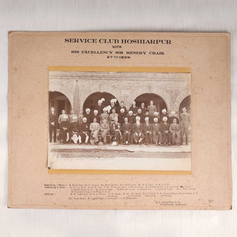Step back in time with this rare vintage photograph capturing His Excellency Sir Henry Craik meeting with the Service Club Hoshiarpur in 1939. This stunning black and white image transports you to late colonial India, providing a window into Anglo-Indian relations during the British Raj. Captured on the 27th of November, 1939, this historical photograph depicts Sir Henry Craik, an eminent British colonial administrator, posing with members of the Service Club in Hoshiarpur, Punjab. The crisp monochrome tones exude old world charm and elegantly preserve a moment frozen in time over 80 years ago. As a photography enthusiast or history buff, you'll appreciate this photograph's vintage aesthetic and its significance as a valuable visual artifact. The image quality is beautifully preserved, letting you admire the distinguished gentlemen in their iconic attire. Whether displayed in your home or archived for posterity, this photograph immortalizes an important meeting in 1939. The rich historical and visual appeal makes this a noteworthy addition to any collection.