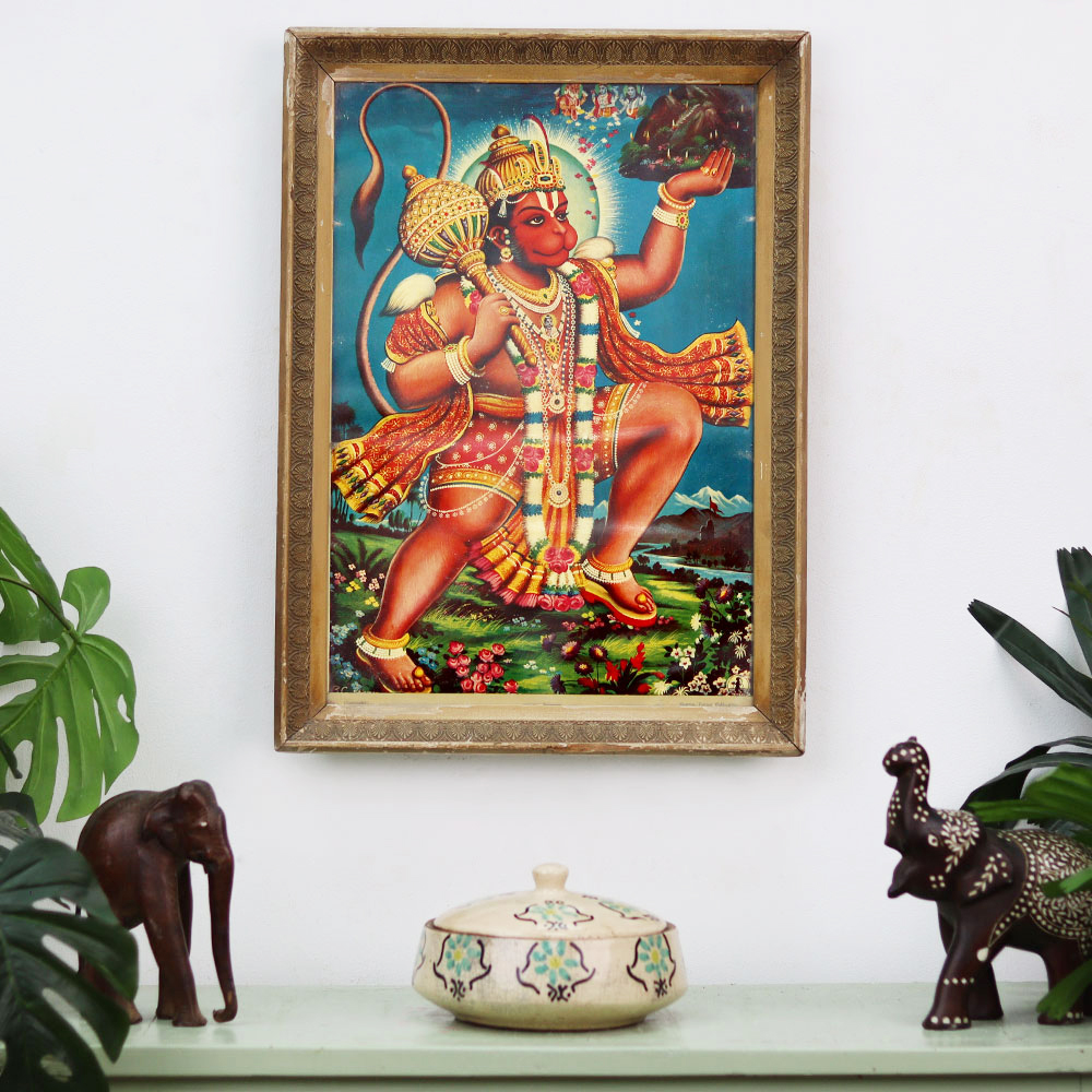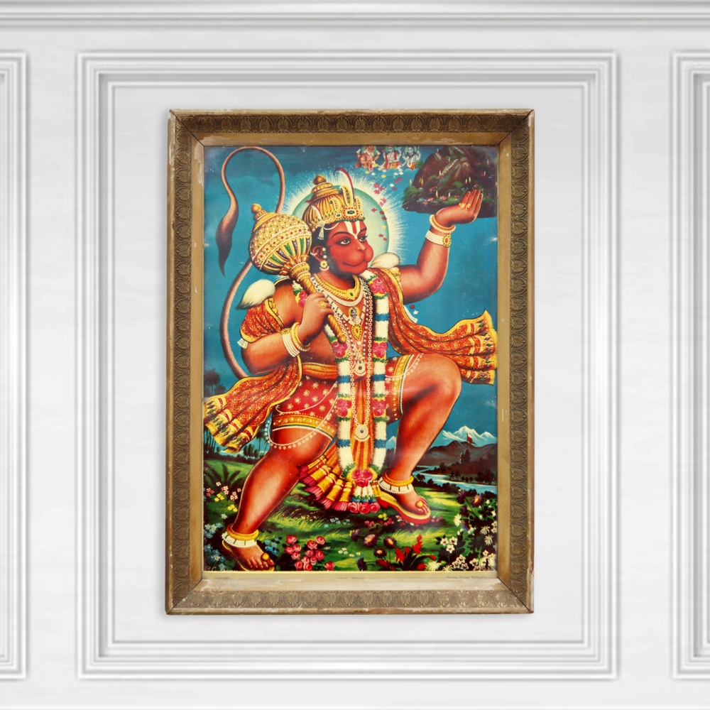 Prepare to be captivated by the breathtaking beauty and profound significance of this vintage print of Lord Hanuman, the revered Hindu deity. Masterfully crafted by the renowned artist B.C. Sharma, this work of art is a true testament to the enduring power of spiritual expression. As you gaze upon this stunning depiction of Lord Hanuman, the embodiment of strength, devotion, and unwavering courage, you'll be transported to a realm of profound spiritual connection. This vintage print serves as a constant reminder to embrace your inner power, overcome obstacles, and deepen your understanding of the divine. Whether you're a devoted Hindu seeking to honor your faith or simply someone who appreciates the beauty and artistry of fine spiritual works, this exceptional print is a must-have addition to your collection. Elevate your home decor and nourish your soul with this timeless piece, which will inspire and uplift you every day.