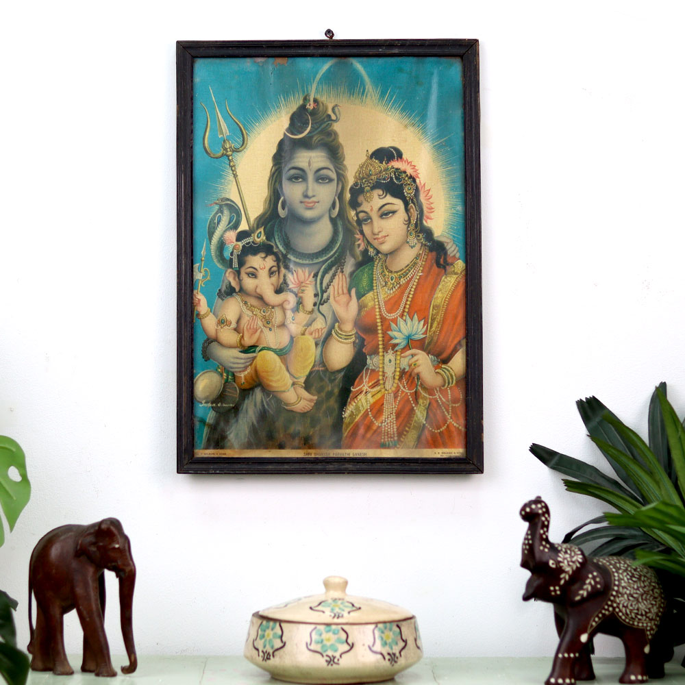 - Stunning depiction of Shiva, Parvati, and Lord Ganesha by renowned artist Indera Sharma