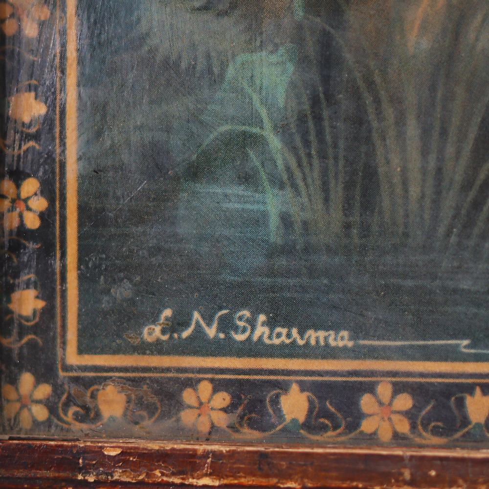 Introduce a sense of timeless beauty and profound spiritual significance into your living space with this stunning vintage original L.N. Sharma print of Lord Vishnu. Masterfully framed in an original wooden enclosure, this captivating work of art is a true testament to the enduring power of Indian artistic tradition. The level of detail and craftsmanship on display is simply breathtaking. From the intricate patterns adorning Lord Vishnu's ornate garments to the serene, meditative expression on his face, every element of this painting has been lovingly rendered with the utmost care. It's a window into a realm of timeless spirituality that will elevate the ambiance of any room, imbuing it with a sense of reverence and contemplative beauty. Whether you're looking to honor your Hindu faith, enhance your art collection, or simply add a visually striking, meaningful piece to your home, this vintage Lord Vishnu print is an absolute must-have. Invite the divine into your living space and let its powerful presence inspire you every day.
