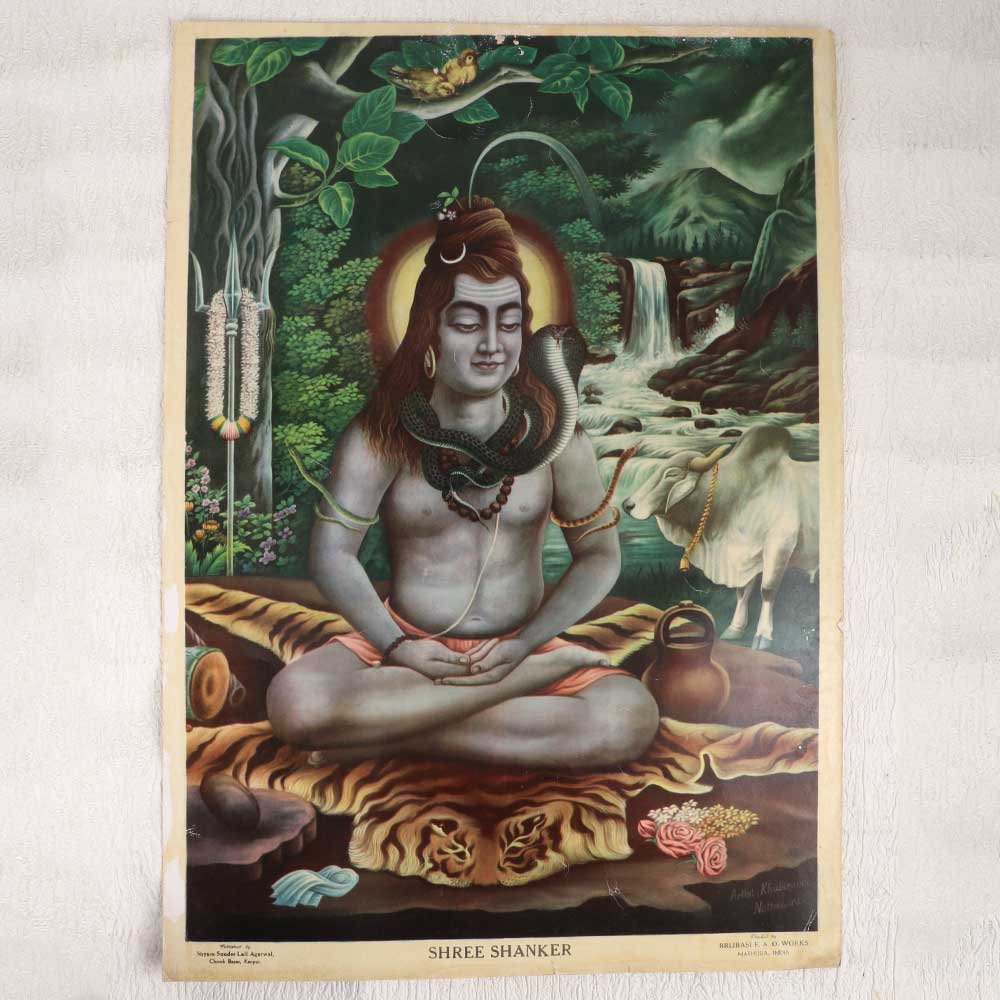 Find your center with this vintage oleograph depicting Lord Shiva deep in meditation. An antique artwork radiating tranquility and divine focus. Let this vintage artwork infuse your space with serenity. The rich hues and meditative imagery promote mindfulness, helping you find your inner calm. An ideal focal point for a home yoga studio, meditation room, or spiritual sanctuary. Place it anywhere you want to be reminded to breathe, relax, and clear your mind. A calming treasure for antique art lovers and spiritual seekers.