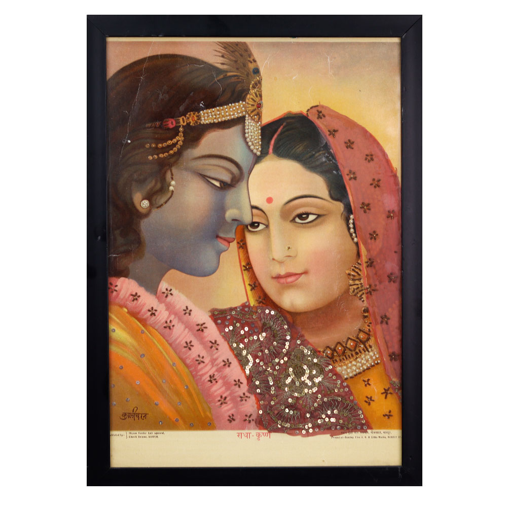 Bask in the timeless beauty of this Vintage Paper Print featuring the iconic Radha Krishna artwork of renowned Indian artist, Kali Charan. Kali Charan's masterful depiction of the divine love between Radha and Krishna is a true work of art. The vivid, jewel-toned hues and delicate brushstrokes transport you to a realm of spiritual beauty and enchantment. This vintage print is a testament to the artist's unparalleled skill and the timeless allure of this sacred subject matter. Whether you're an avid art collector or simply seeking to infuse your home with cultural richness, this stunning piece is a must-have. It will serve as a breathtaking centerpiece, sparking conversations and igniting the imagination of all who behold it. Invest in a timeless treasure that will be cherished for generations to come.