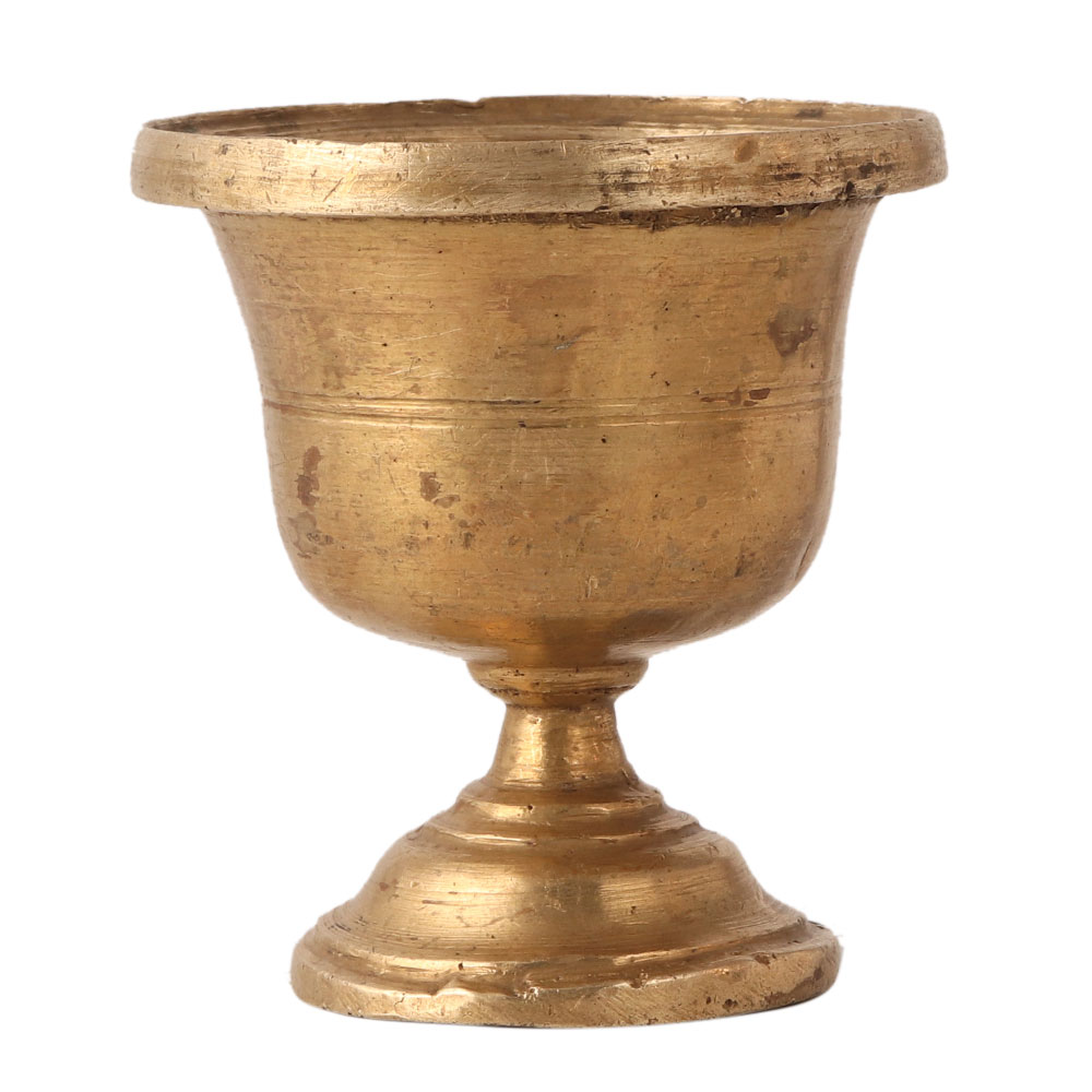 This vintage cup has a plain design. It is made of bronze and has a stand. It has a golden appearance. You can use it in rituals to shop holy water or use it as a diya (lamp) to worship the god.