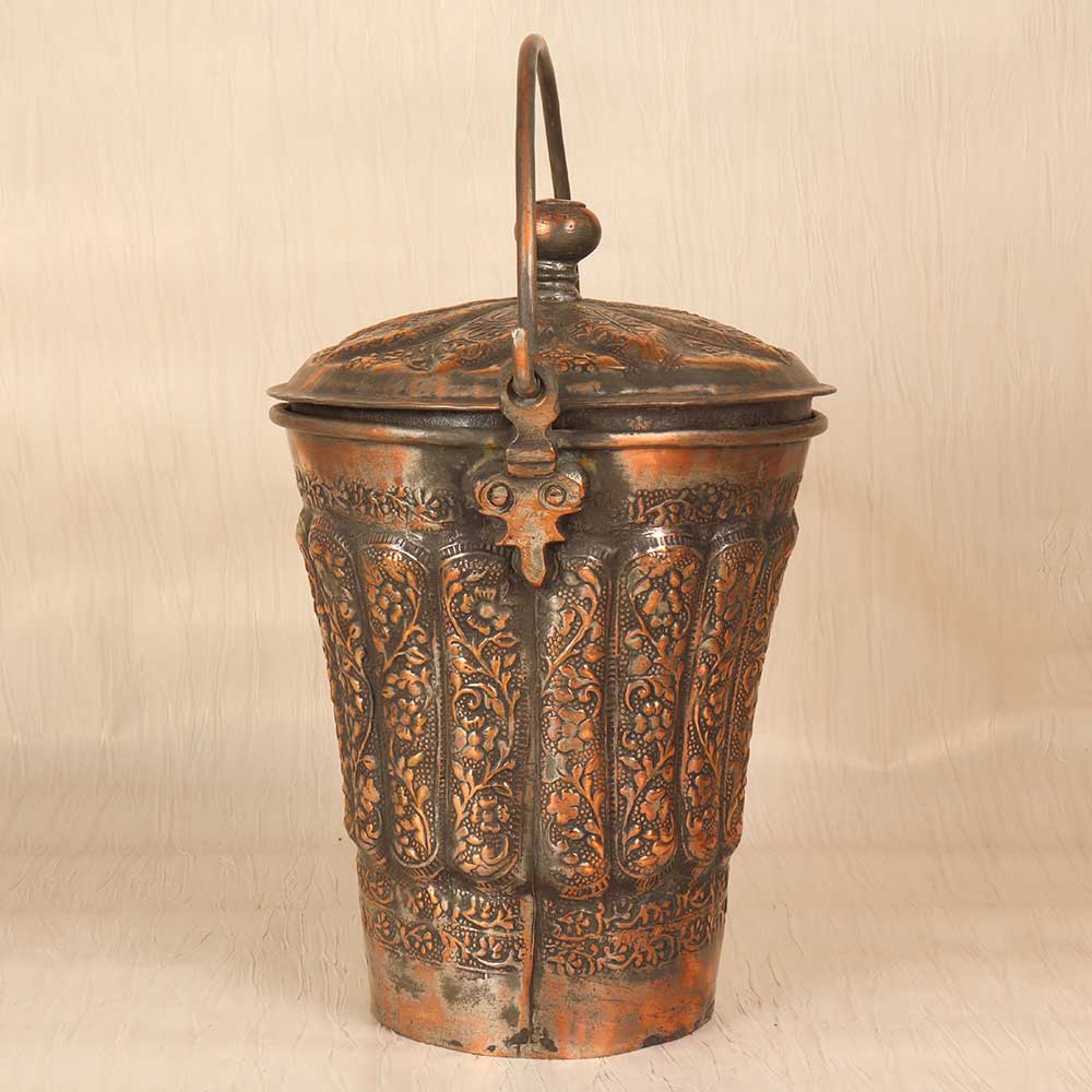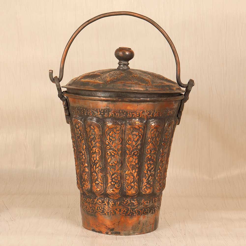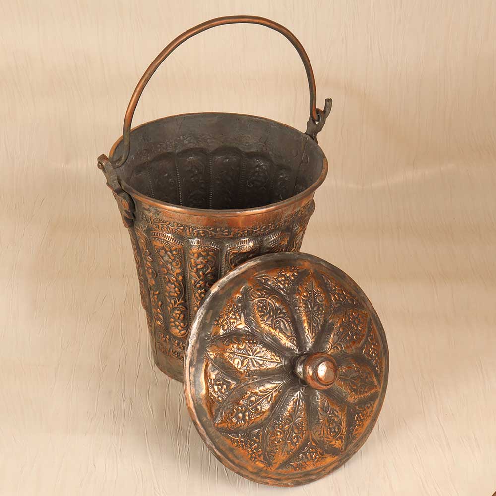 Step back in time with this antique Islamic copper bucket. The hand-hammered design and aged patina reflect old-world craftsmanship that can't be replicated today. This stunning bucket adds a touch of vintage elegance to any space. This copper bucket is perfect for stowing away blankets, firewood, toys, and anything else you want out of sight. The vintage styling enhances any room as a decorative accent piece. Use it as a chic planter in a sunroom, place it in a bathroom to hold towels, or allow it to spruce up an entryway by holding umbrellas. For antique lovers wanting to add old-world charm to their home, this vintage copper bucket is a must. The quality and workmanship connect you to generations past. Let this become a timeless heirloom passed down for years to come.
