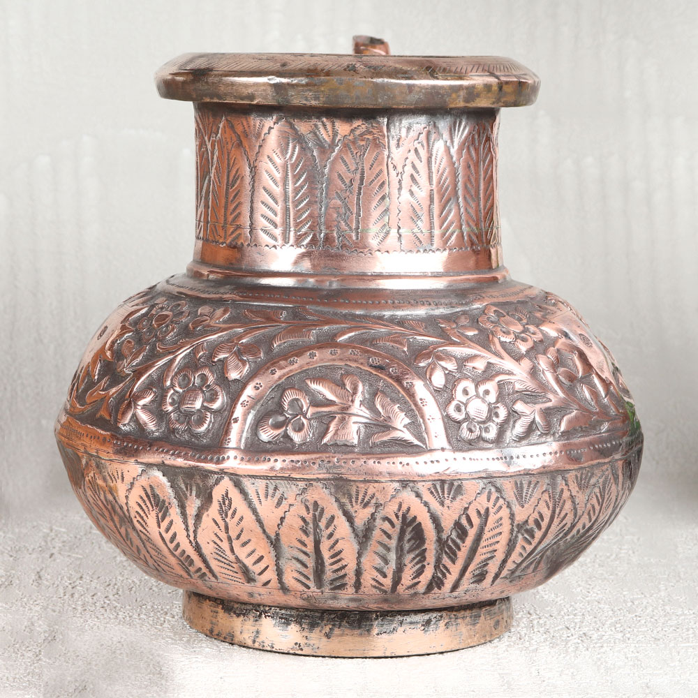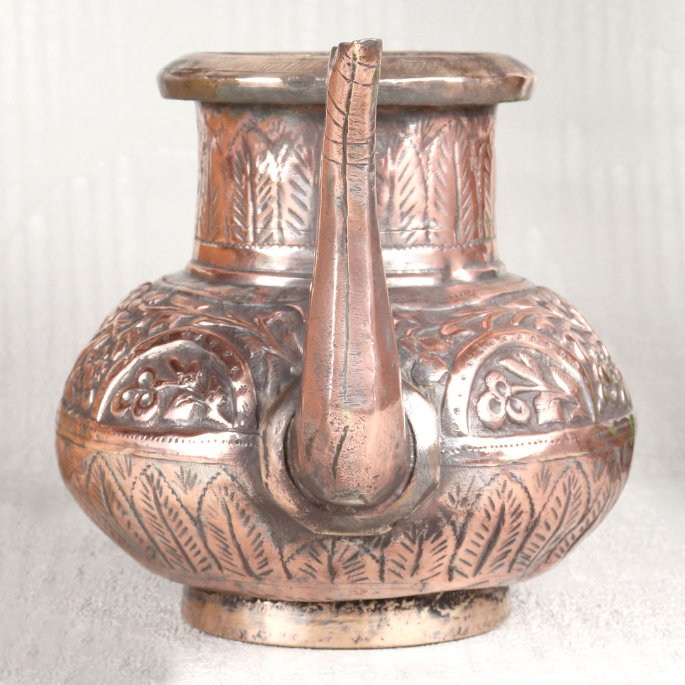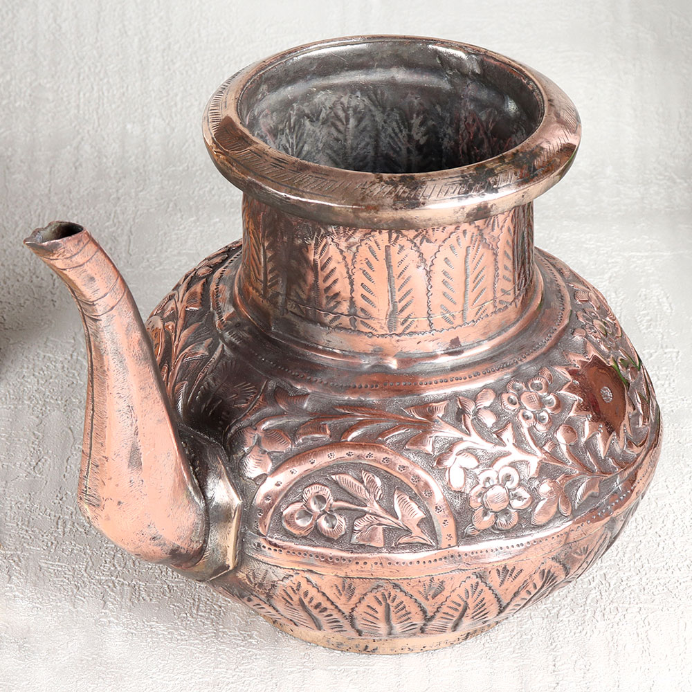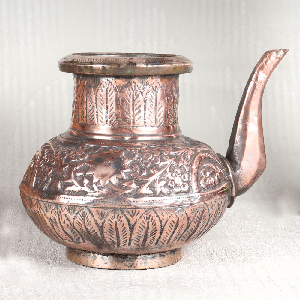 This Vintage Copper Water Pot with Spout is adorned in an enchanting antique brown finish. This exquisite creation is more than just a vessel, it's a piece of art that transcends time and tradition. Handcrafted by skilled Indian craftsmen hailing from the illustrious lineage of Islamic Art in Hyderabad, this pot is a testament to their craftsmanship. Fashioned from high-quality copper, this water pot boasts intricate engravings that tell stories of a bygone era. Its delicate designs are a testament to the dedication and artistry of its creators. This versatile piece can grace your home, office, restaurant, hotel, or cafe's prayer room, adding an air of sophistication and reverence. It's equally at home in a temple, enhancing your spiritual rituals. For vintage collectors, it's a coveted gem, and for exhibition enthusiasts, it's a show-stopping centerpiece. Furthermore, it makes for a thoughtful gift on special, festive, or auspicious occasions, symbolizing tradition, craftsmanship, and heritage. Elevate your surroundings with this Vintage Copper Water Pot, a true embodiment of art and culture.