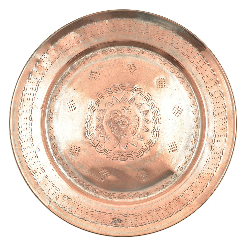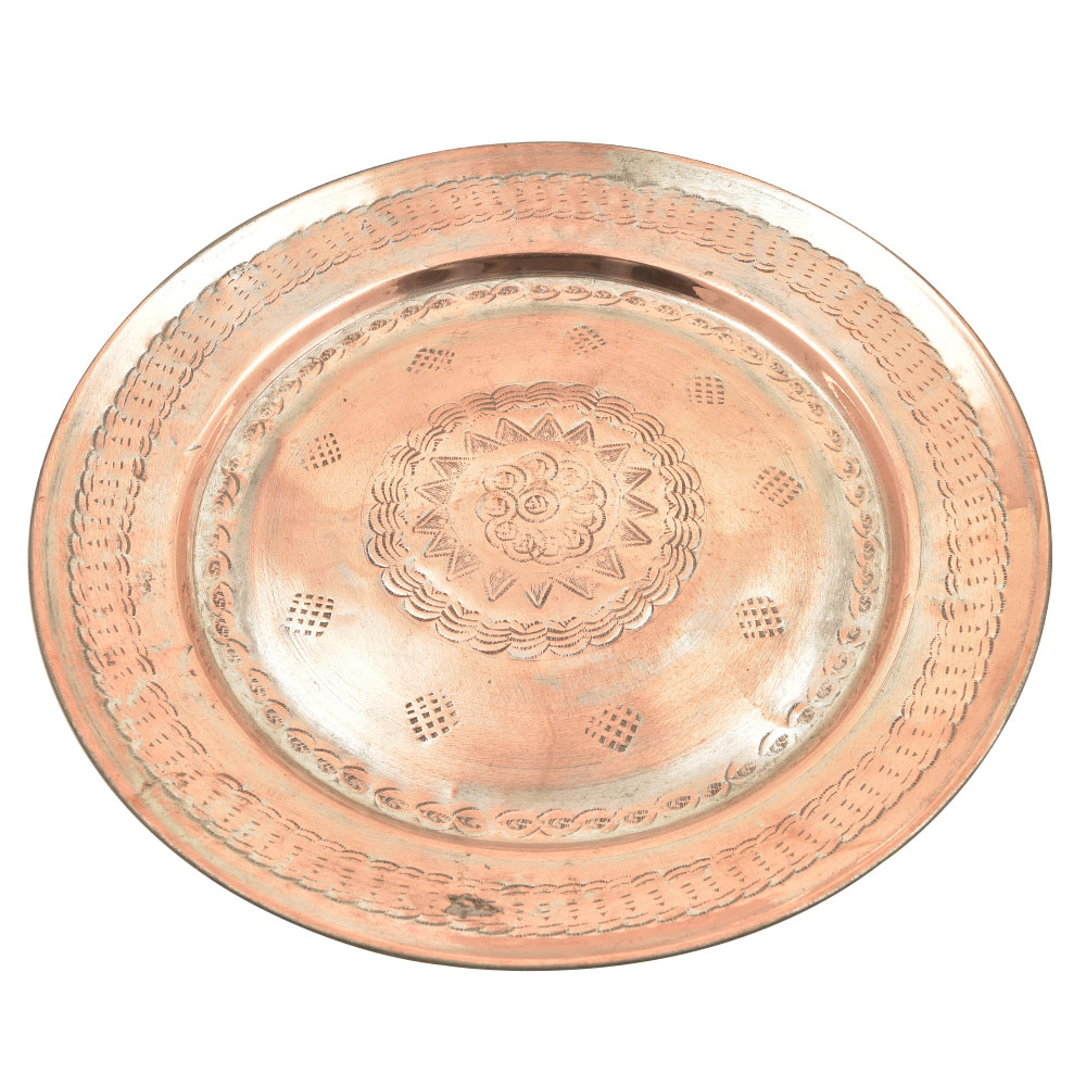 This simple looking copper plate has a floral motif in the centre of the plate with a simple lace design engraved pattern on the border is made by expert craftsmen using traditional techniques and also serves as a great home décor product.