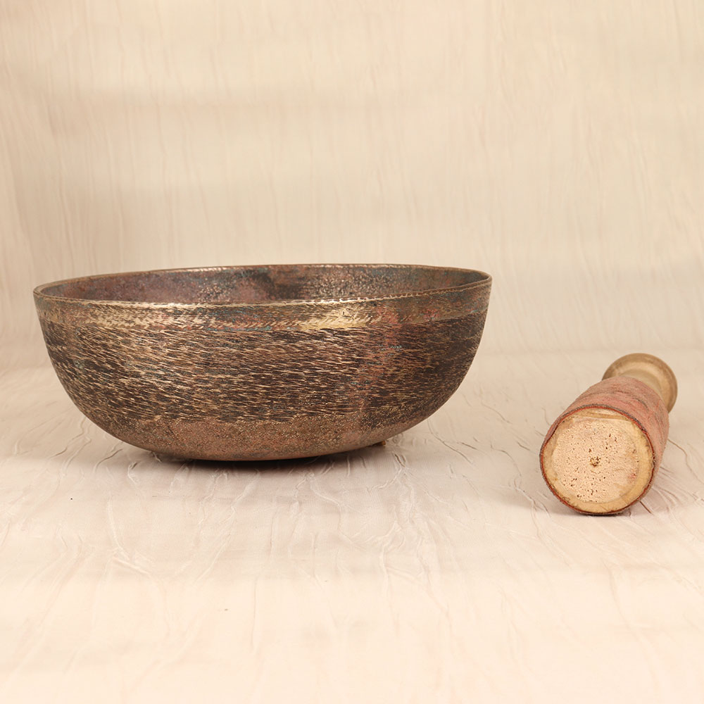 Unlock the secrets of the cosmos with this captivating om singing bowl, a stunning work of functional art that will elevate your mindfulness practice to new heights. Forged from a rare alloy of copper, tin, and other precious metals, this vintage-inspired piece emanates a hauntingly beautiful tone that will transport you to a state of profound calm and clarity. Whether you're a seasoned yogi or simply seeking a natural way to unwind, this om singing bowl is your gateway to a higher plane of consciousness. The resonant vibrations it produces trigger the body's relaxation response, lowering stress hormones and allowing your mind to drift into a blissful, meditative state. Use the included wooden mallet to effortlessly create mesmerizing tones that reverberate through your entire being, guiding you towards inner peace and spiritual enlightenment. This om singing bowl makes the perfect addition to any mindfulness practice, home meditation space, or sacred ritual. Elevate your daily routine and unlock the healing power of the universe with this stunning, one-of-a-kind singing bowl.