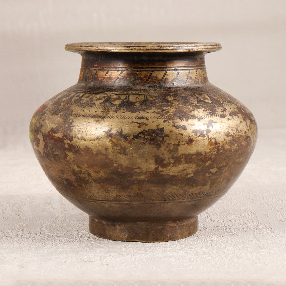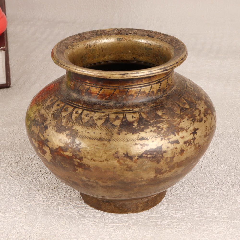 Immerse your sacred moments in the divine ambiance with this exquisite Vintage Brass Holy Water Pot. Handcrafted by skilled artisans from Gujarat, India, this masterpiece boasts intricate carvings and a warm antique brown finish that reflects the rich cultural heritage of the region. Fashioned from high-quality Brass, the pot serves as a vessel for holy water during prayers, havans, and auspicious occasions, radiating a sense of sanctity. Versatile in its utility, the pot transforms into a vessel for floral embellishments, enhancing its charm during festive celebrations. Its timeless elegance makes it a perfect addition to your home, office, restaurant, hotel, or cafe, elevating the aesthetic appeal of any space. This antique masterpiece is not merely a decorative piece but also a meaningful addition to vintage collections. Gift this ethereal creation to your family, friends or relatives on special occasions, ushering blessings and a touch of Indian craftsmanship into their lives. Celebrate spirituality and tradition with this vintage treasure that transcends time.