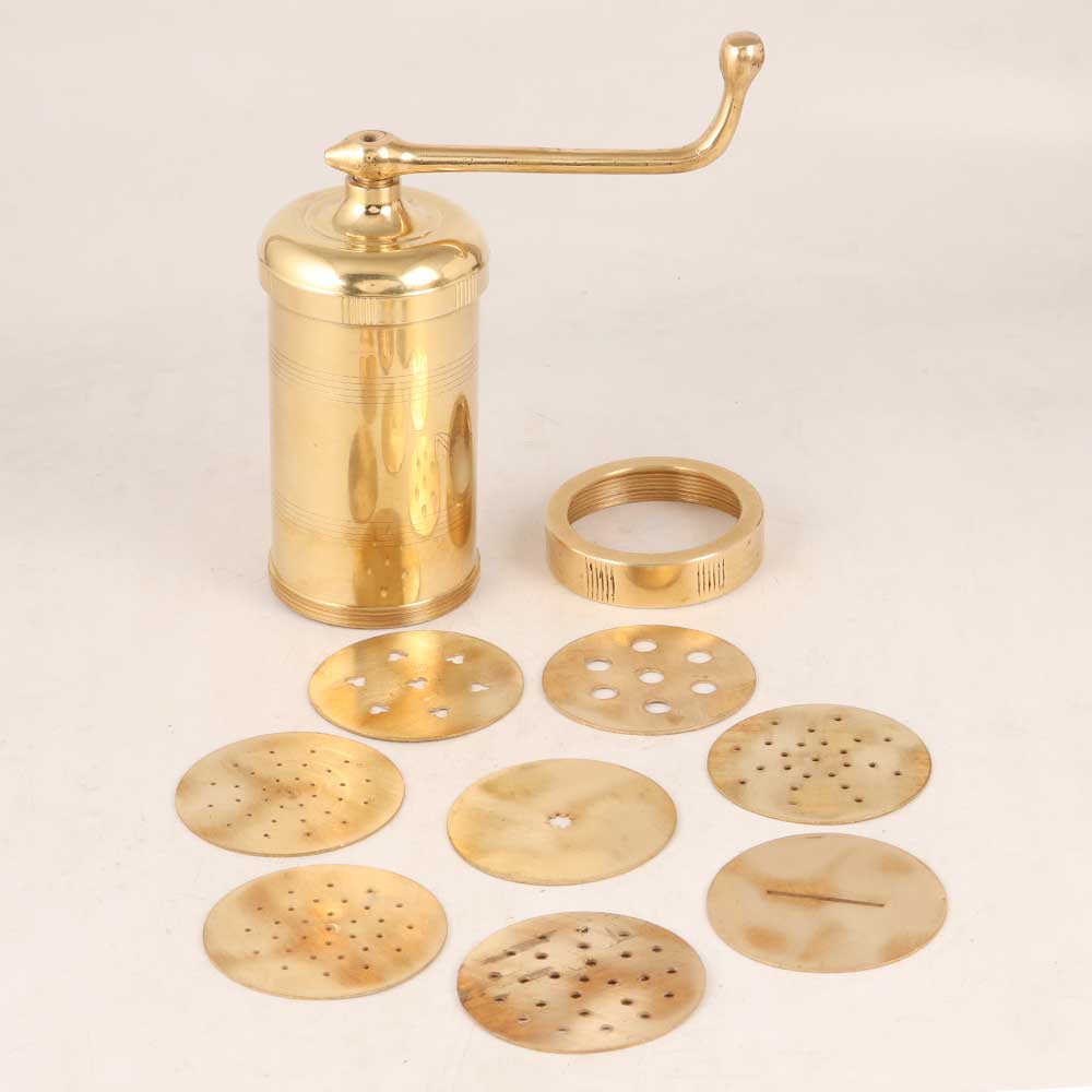 This vintage brass kitchen utensil is an artistic masterpiece crafted with precision and love by highly skilled and experienced Indian craftsmen. This timeless piece harks back to the golden era of culinary craftsmanship, adding a touch of old-world charm to any setting. Fashioned from high-quality brass, this kitchen utensil boasts a lustrous golden finish, reflecting the brilliance of its handmade creation. Originally designed for making noodles, we now recommend it for decorative purposes only due to its age and historical significance. Its alluring appearance makes it a versatile addition to various spaces, whether it be adorning the kitchen shelf at home, adding elegance to the office space, enhancing the ambiance of a restaurant, hotel, or cafe, or serving as a captivating display at exhibitions. It perfectly complements vintage collections, becoming a cherished centerpiece that sparks conversations and fond memories. Additionally, this ornamental piece is an ideal gift for your loved ones on special, festive, or auspicious occasions. Share the nostalgia and heritage of Indian craftsmanship with a unique present that captures the essence of culinary history and artistic expression.