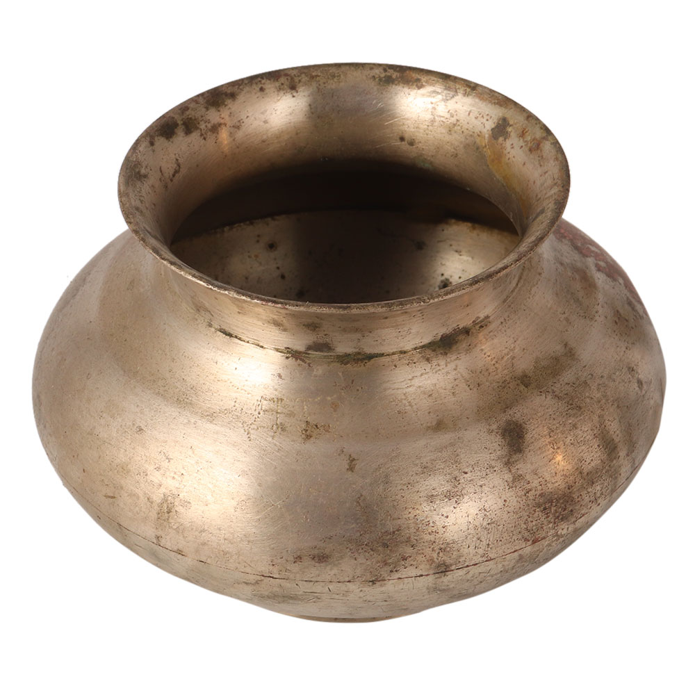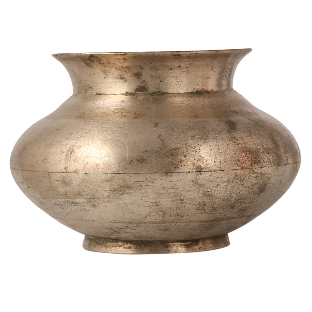 A used vintage style Kalash water pot with a wide belly. It is made of white metal alloy and has a matte appearance. It is used for storing sacred water from the river Ganga. In Hindu rituals, the Kalash plays an important role to keep the holy water, rice or gold coins. A must have in the collection for vintage collectors.