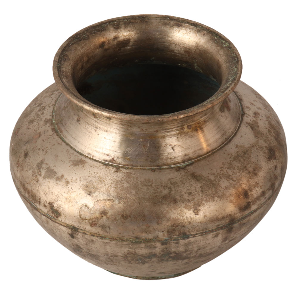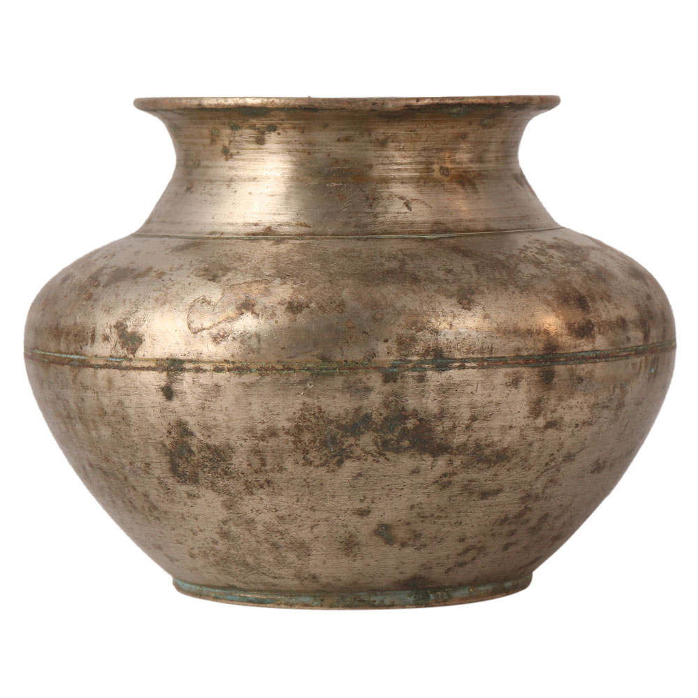 This used Gangajal water pot made of a white metal alloy has a vintage look with a faded appearance. It has been carved with a circular ring that passes through its center. It has an antique finish. It is handmade by skilled artisans from North India. Gift it to your loved ones.