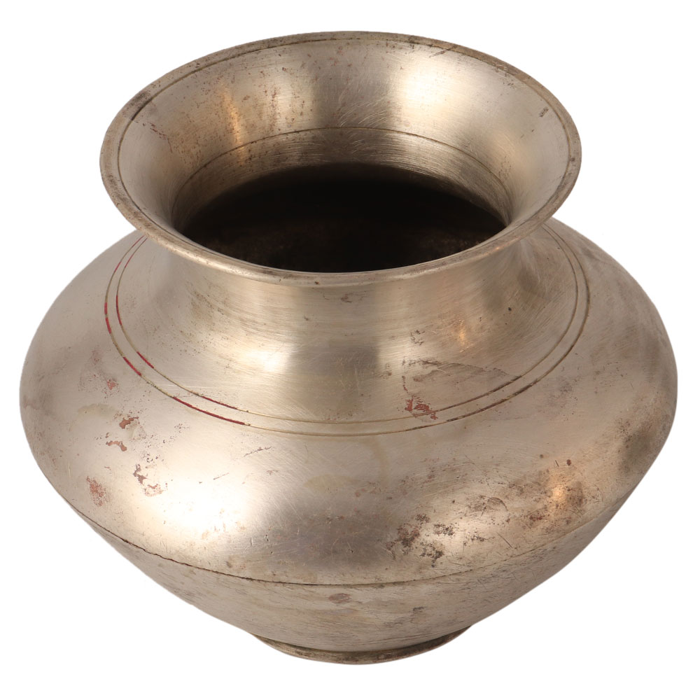 A vintage style used water pot is carved from white metal alloy. It has a shiny appearance and was handmade by local craftsmen in northern India. It is believed that placing the pot in the north or east direction in the room spreads the positive energy. It can be used as a decorative item in your collection.