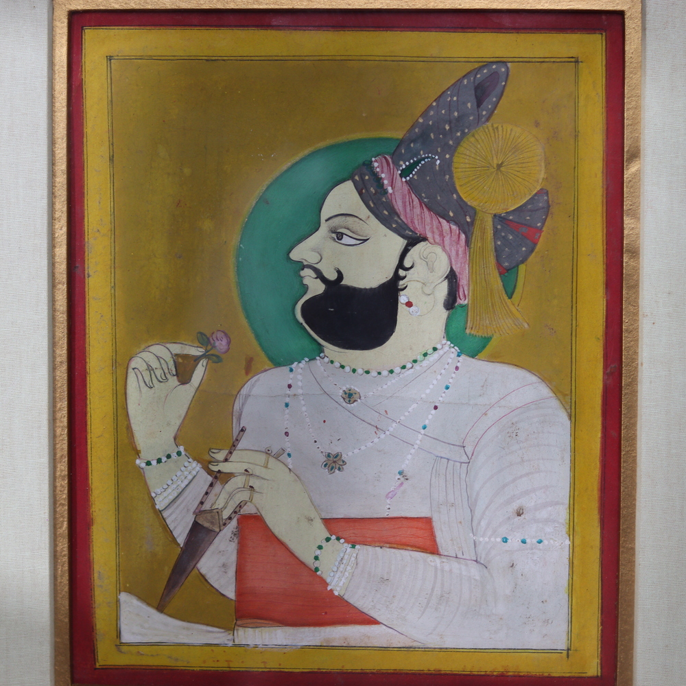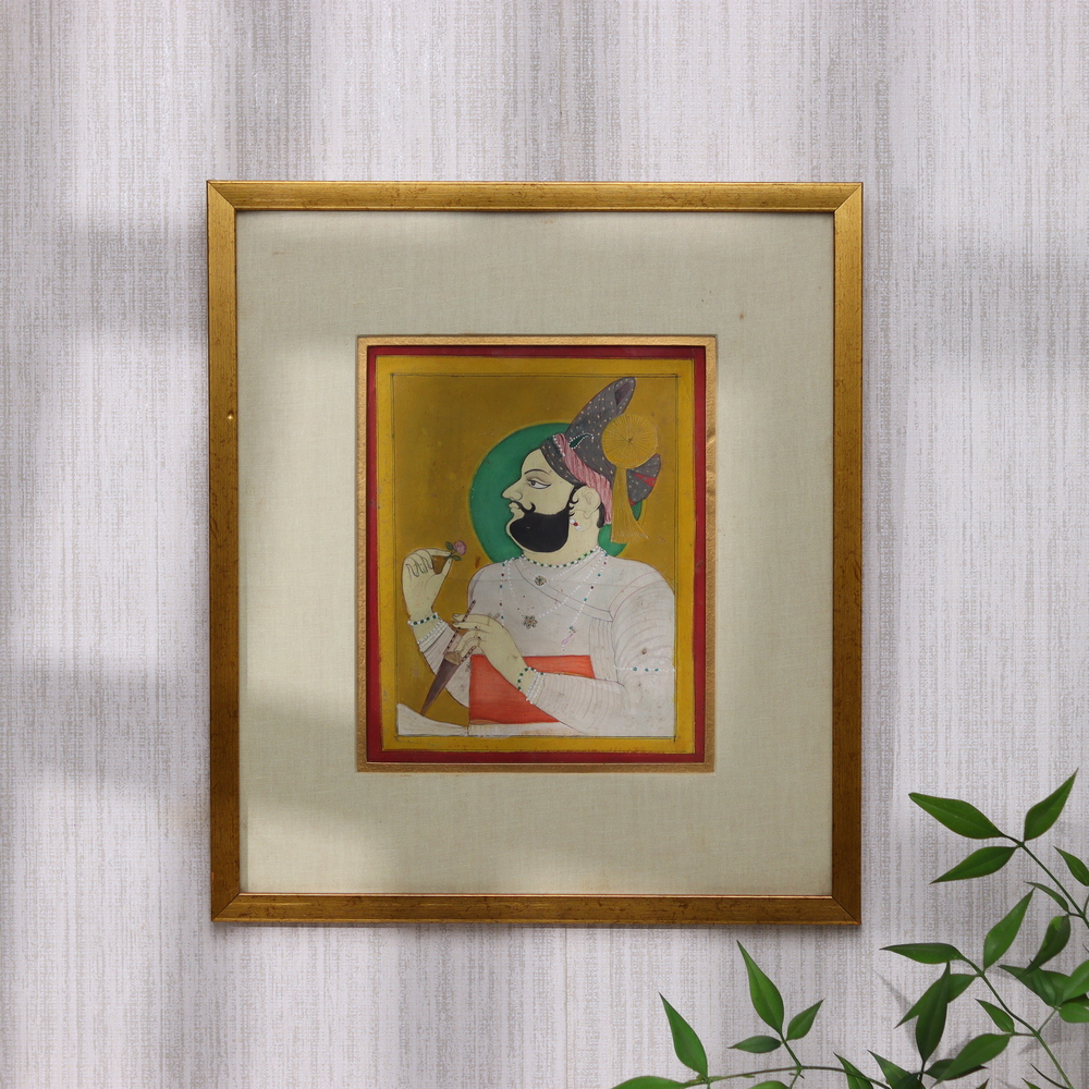 Immerse yourself in the captivating world of traditional Indian art with this exquisite used miniature watercolor painting by the renowned artist Bhawani Singh Chauhan. Hailing from the vibrant region of Rajasthan, this stunning work of art is a testament to the rich cultural legacy and artistic mastery that have defined the area for generations. Feast your eyes on the painting's mesmerizing details and vivid hues, which transport you to the heart of Rajasthan's enchanting landscapes and vibrant traditions. From the intricate patterns to the striking color palette, every element of this piece has been crafted with the utmost care and attention, ensuring that it stands as a true masterpiece of Indian artistry. Whether you're an avid collector or simply appreciate the beauty of traditional craftsmanship, this painting is a must-have addition to your home or office. The piece has been newly framed in a contemporary style, allowing it to seamlessly blend with modern decor while still showcasing the timeless elegance of its original design. Elevate your space and surround yourself with the captivating essence of Rajasthan's rich cultural heritage.