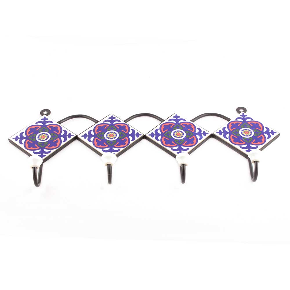 White And Navy Blue Ceramic Floral Tiles Hooks. When Put on Wall or Cabinet It is An Art in Itself. The Metal Part of this Hook is Black Powder Coated.