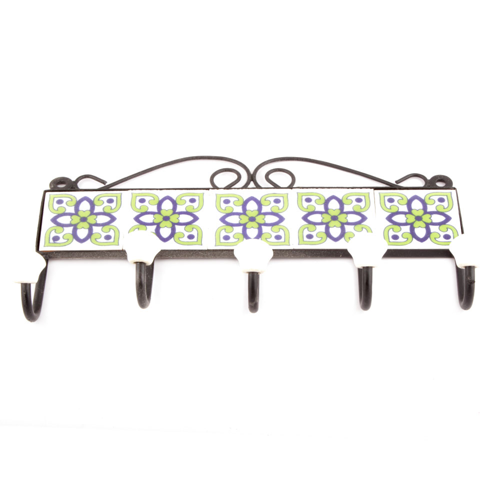 White And Navy Blue Ceramic Floral Tiles Hooks. When Put on Wall or Cabinet it is an Art in itself. The Metal Part of this Hook is Black Powder Coated.