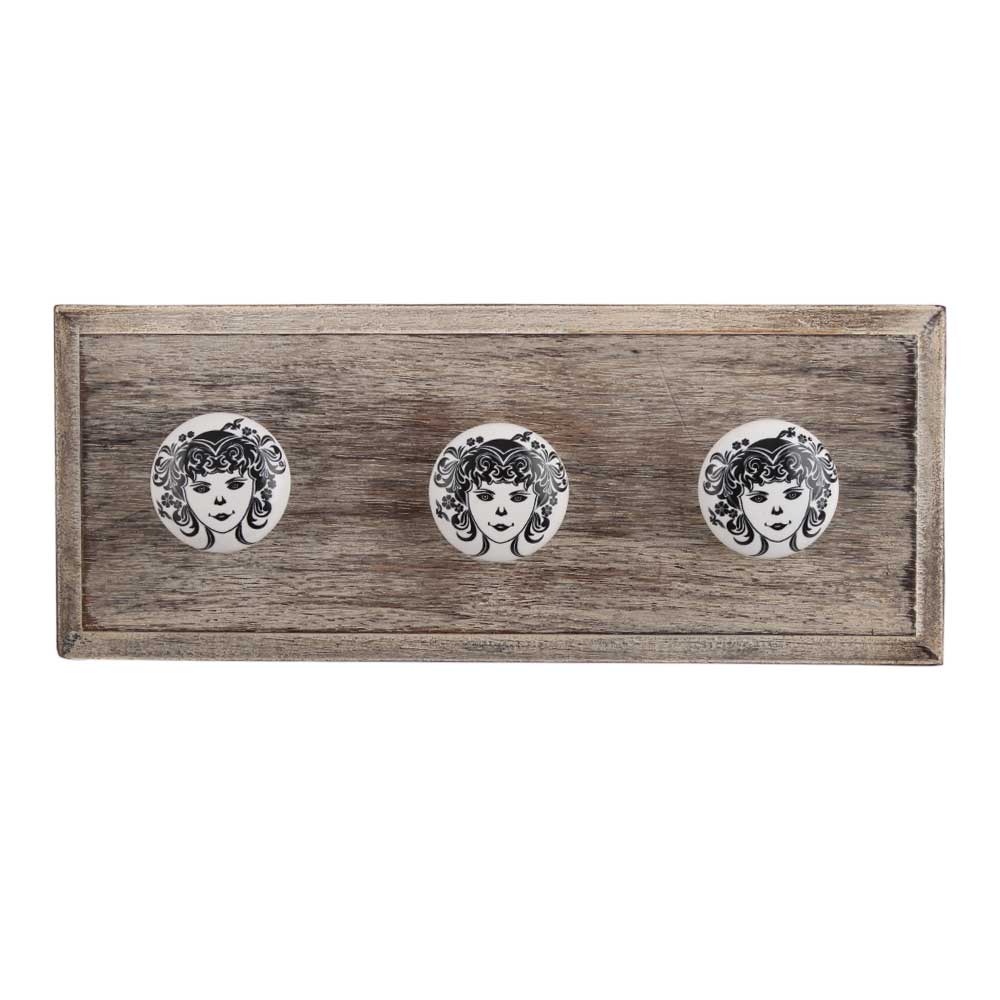 White Base Black Baby Flat Ceramic Wooden Hook. A Perfect Complement to the Soft Tone of the Wood are these White Traditional Hat & Coat Hook Made of Genuine Porcelain and Brass. It can be use to Hang Jewellery, Leashes, Towels, Scarves, Light Weight Sweaters, Caps Etc.