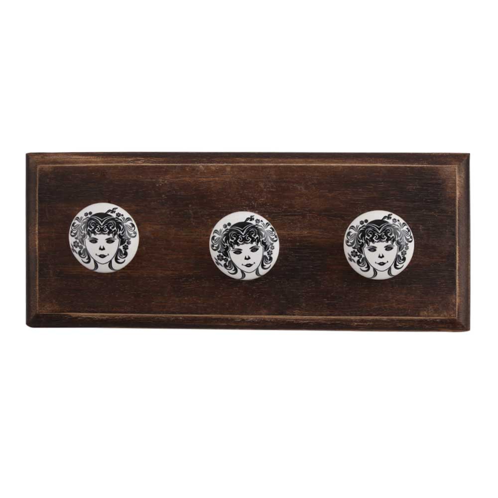 White Base Black Baby Flat Ceramic Wooden Hook. A Perfect Complement to the Soft Tone of the Wood are these White Traditional Hat & Coat Hook Made of Genuine Porcelain and Brass. It can be use to Hang Jewellery, Leashes, Towels, Scarves, Light Weight Sweaters, Caps Etc.