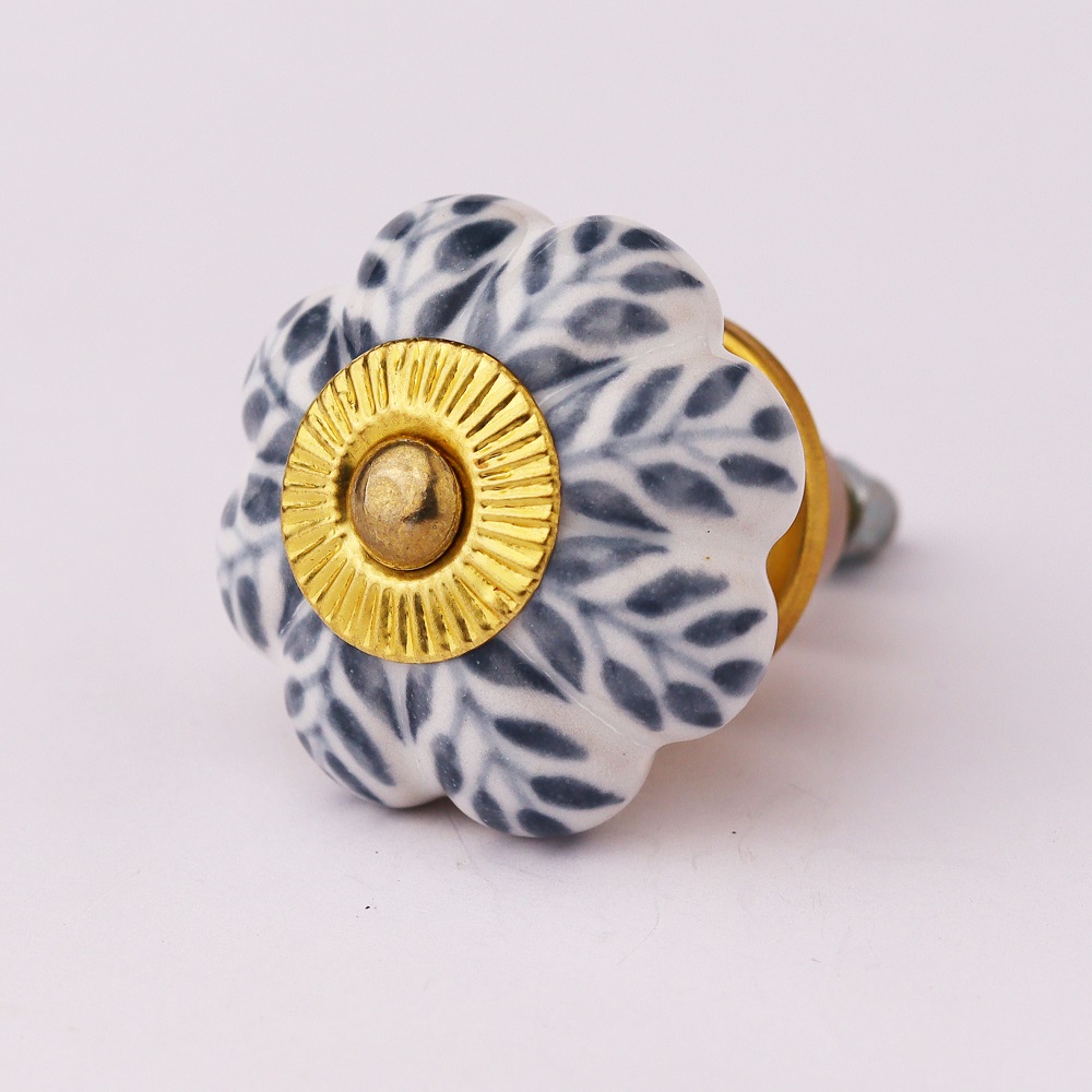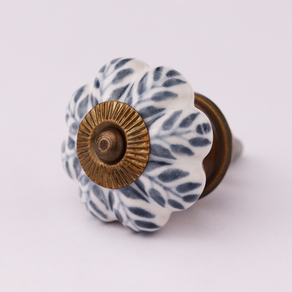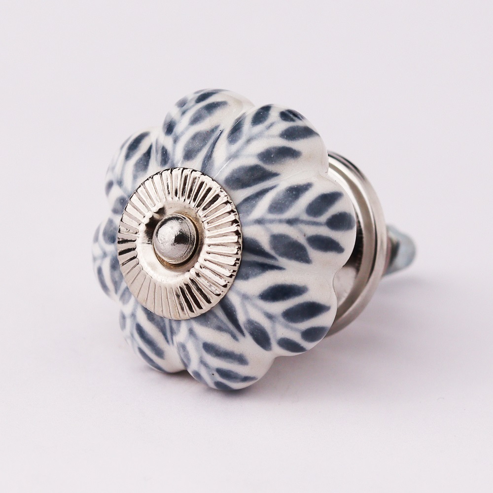 This ceramic floral melon knob is designed to enhance your cabinets, dressers, or drawers, standing out with its unique shape and intricate grey leaf pattern. It creates a gentle yet striking contrast against the white backdrop, resulting in an eye-catching appearance. Perfect for those who value understated beauty and nature-themed designs, this knob is versatile enough to suit various furniture styles.