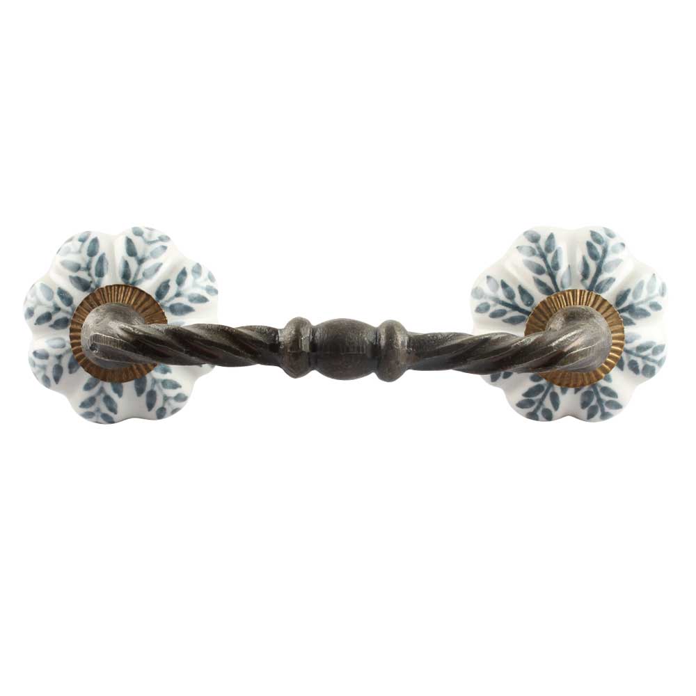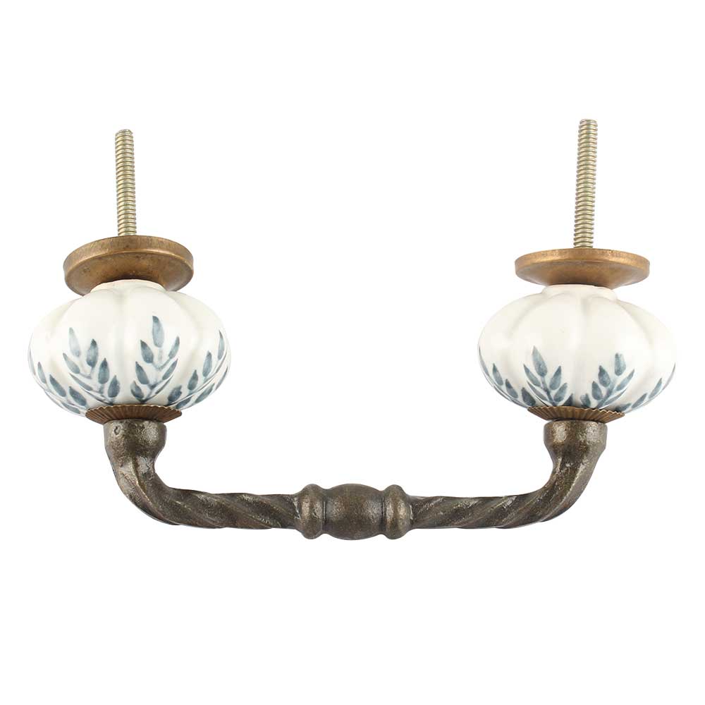 White Base Grey Leaf Ceramic Melon Cut Bridge Handle. Ideal for Drawer, Dresser, Cabinet, Wardrobe, Cupboard and Almirah etc.