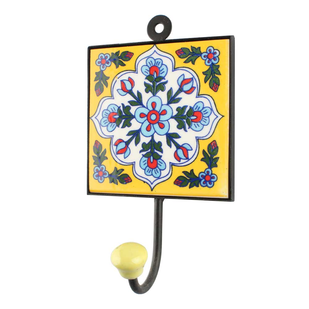 White Base Turquoise Ceramic Floral Tiles Hook. When Put on Wall or Cabinet It is An Art in Itself. The Metal Part of this Hook is Black Powder Coated.