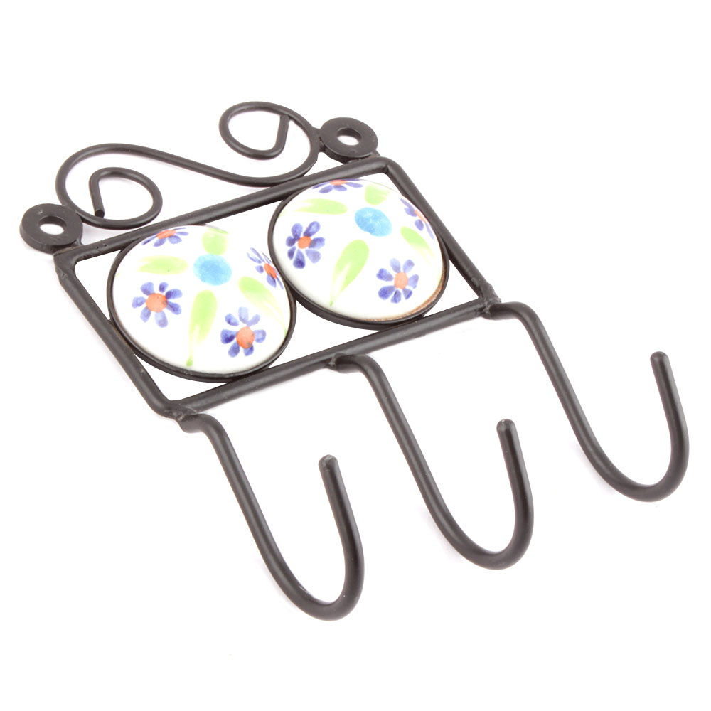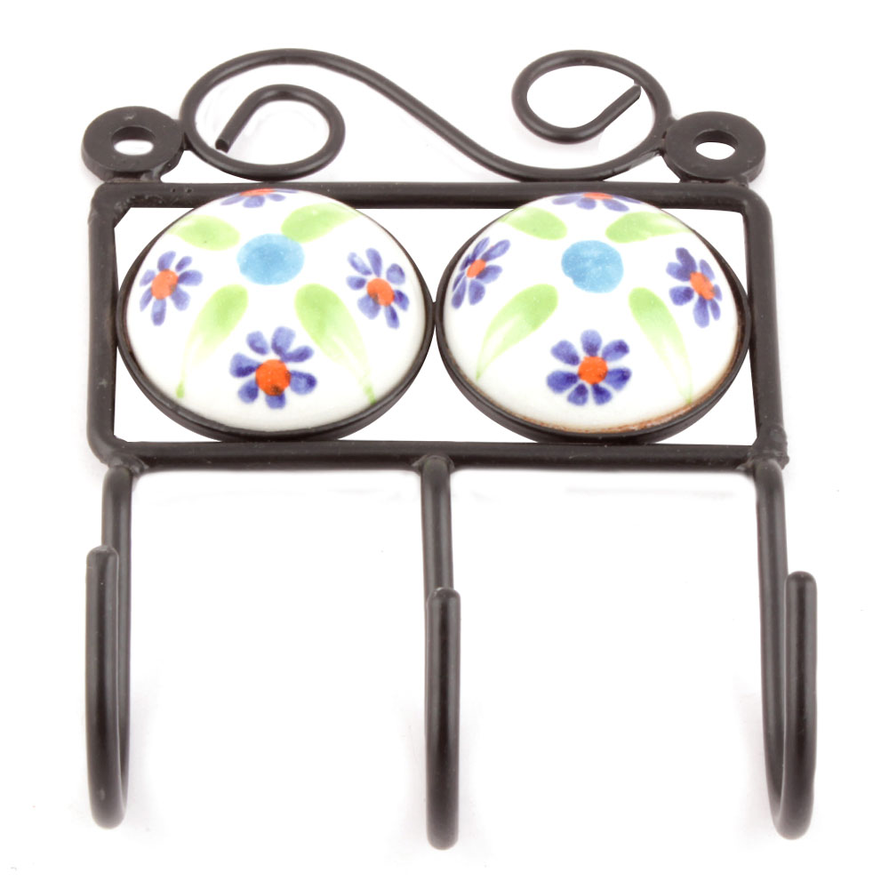 White Blue Tiny Flower Tiles Hooks. When Put on Wall or Cabinet it is an Art in itself. The Metal Part of this Hook is Black Powder Coated.