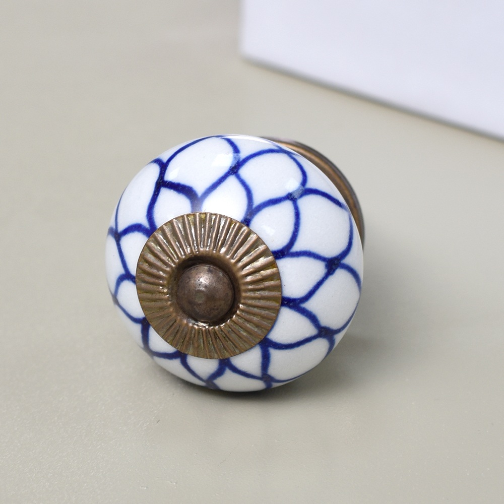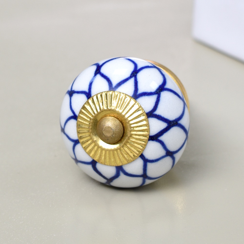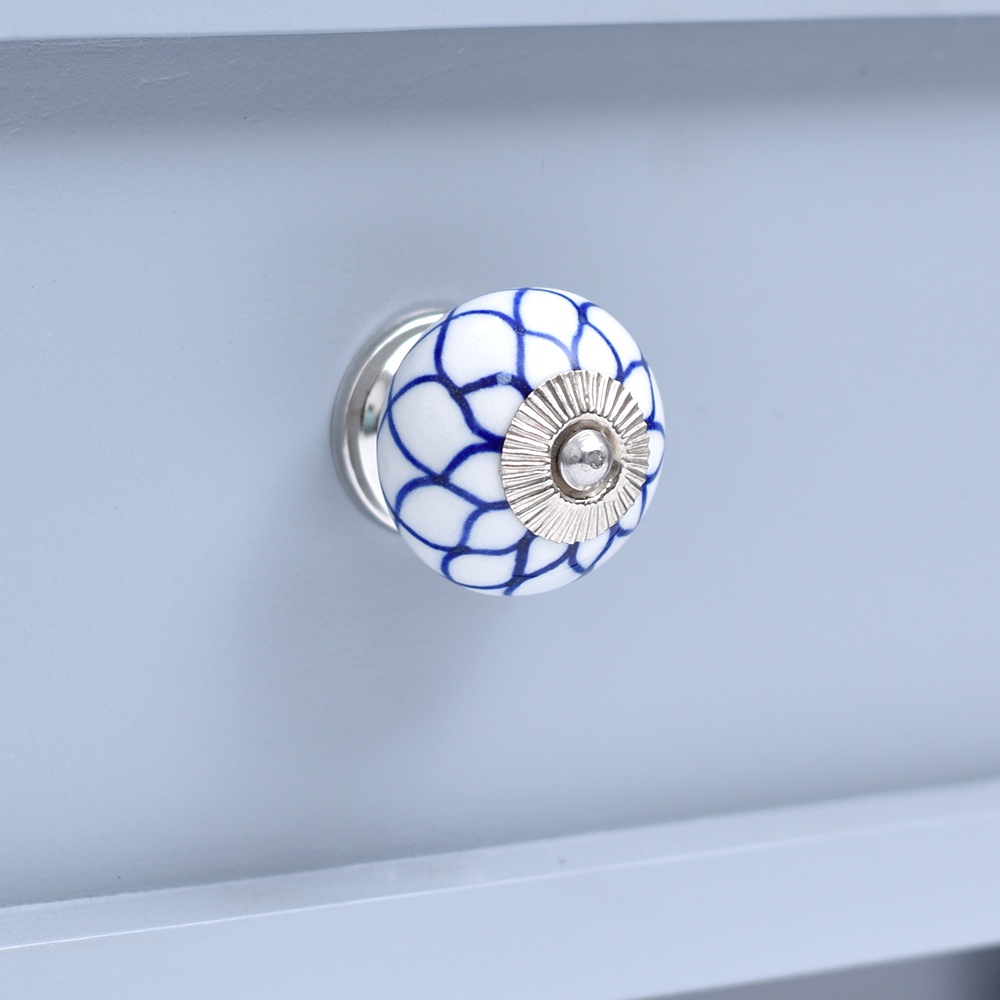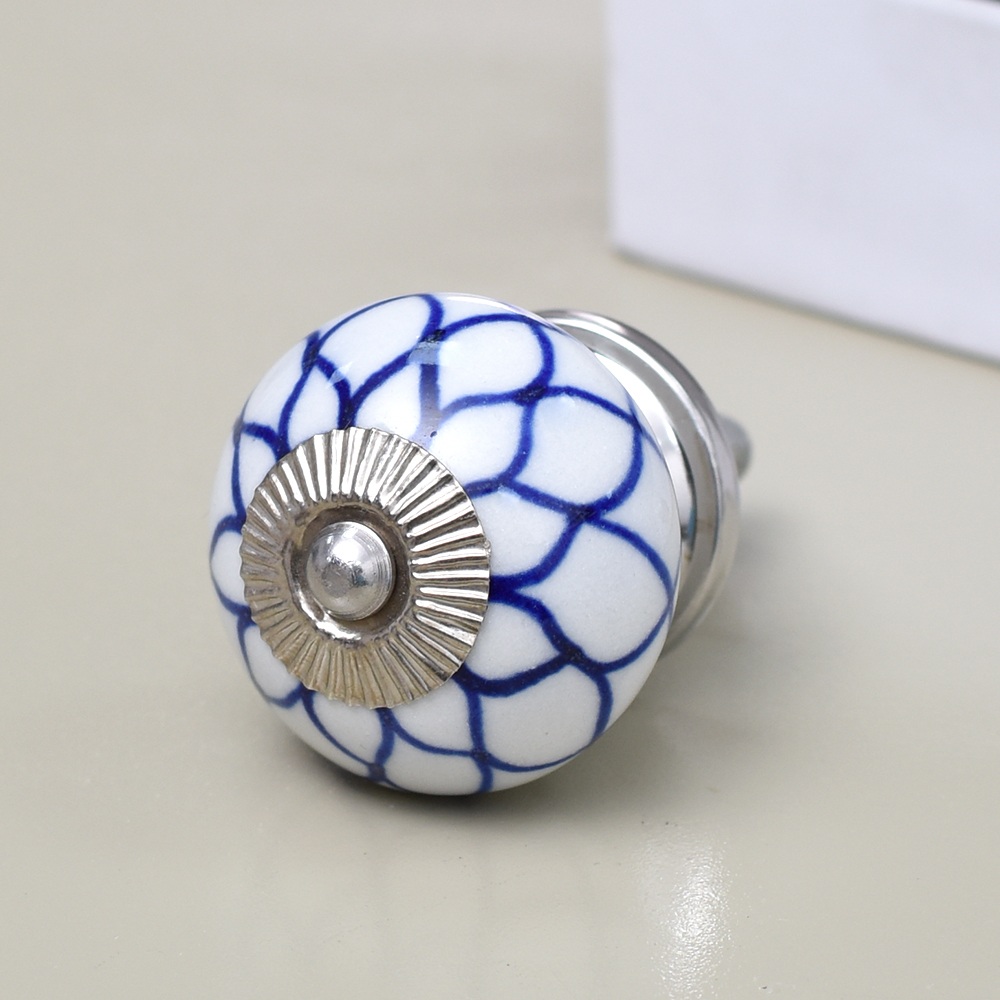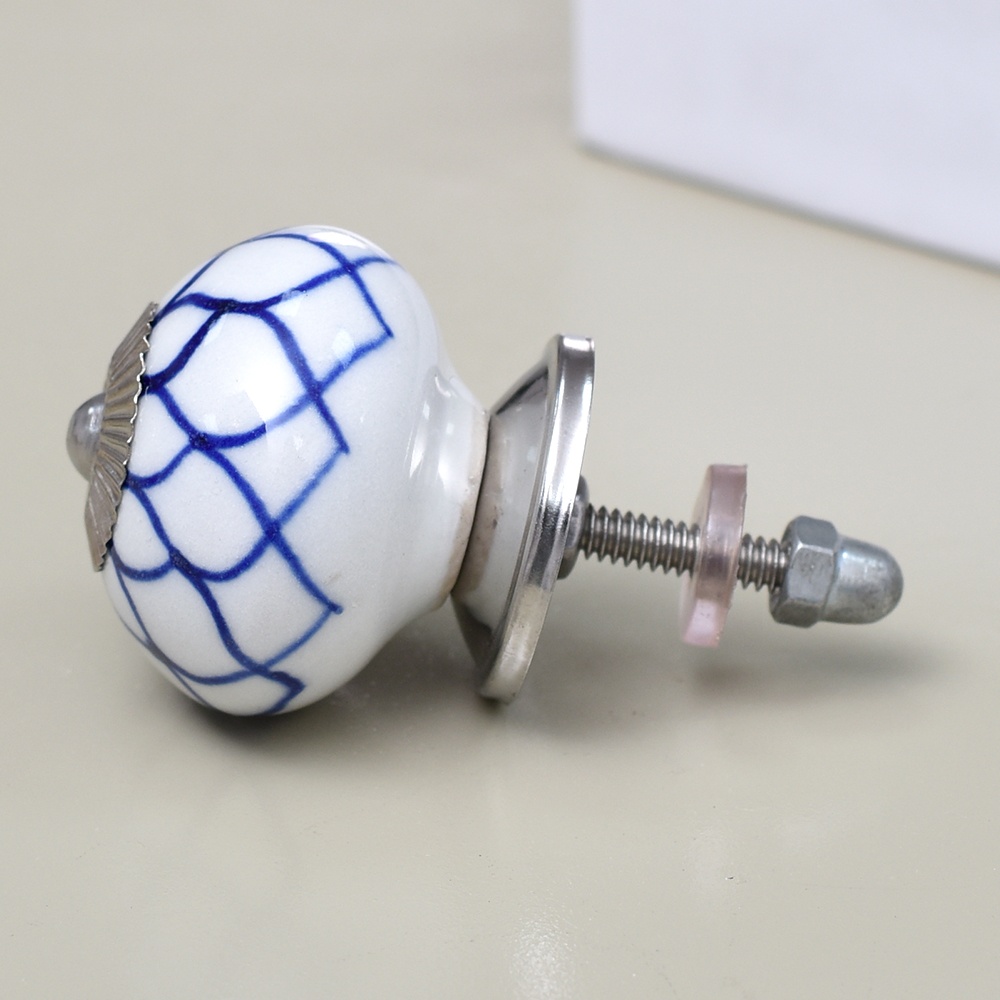 Enhance the aesthetic of your furniture with our exquisite Ceramic Round Knob in a pristine white and blue finish. This stunning knob is not just a functional piece but also a work of art, handcrafted by skilled Indian artisans who have honed their craft for generations. The intricate flower design adds a touch of elegance and charm to any drawer, dresser, cabinet, wardrobe, cupboard, or almirah. Our Ceramic knob is the epitome of luxury and craftsmanship, making it the perfect choice for both residential and commercial spaces. It's not just handles for cabinets and drawers, it's a statement of your impeccable taste. Whether you're looking to upgrade your kitchen handles for cabinets or add a touch of opulence to your office, hotel, cafe, or shop, this knob is the ideal choice. Moreover, it's an ideal gift for your family, friends or relatives on special or festive occasions. Show them you care by gifting them a piece of Indian craftsmanship that exudes beauty and sophistication. Transform your space with our Ceramic Round Knob and experience the magic of artistry and functionality seamlessly blended into one.