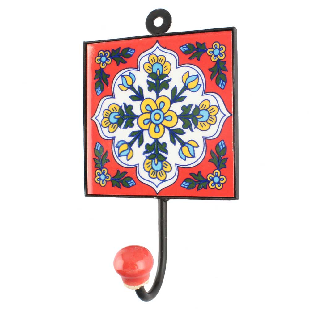 White Ceramic Floral Tile Hook Online. When Put on Wall or Cabinet It is An Art in Itself. The Metal Part of this Hook is Black Powder Coated.