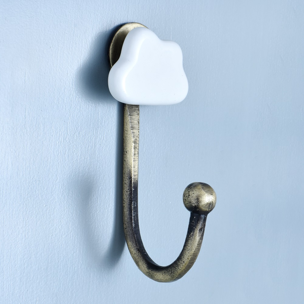 Material: Handcrafted ceramic cloud with antique-style metal hook Finish: Glossy white ceramic with weathered antique brass metal Installation: Single-screw mount; wall plug and screw included