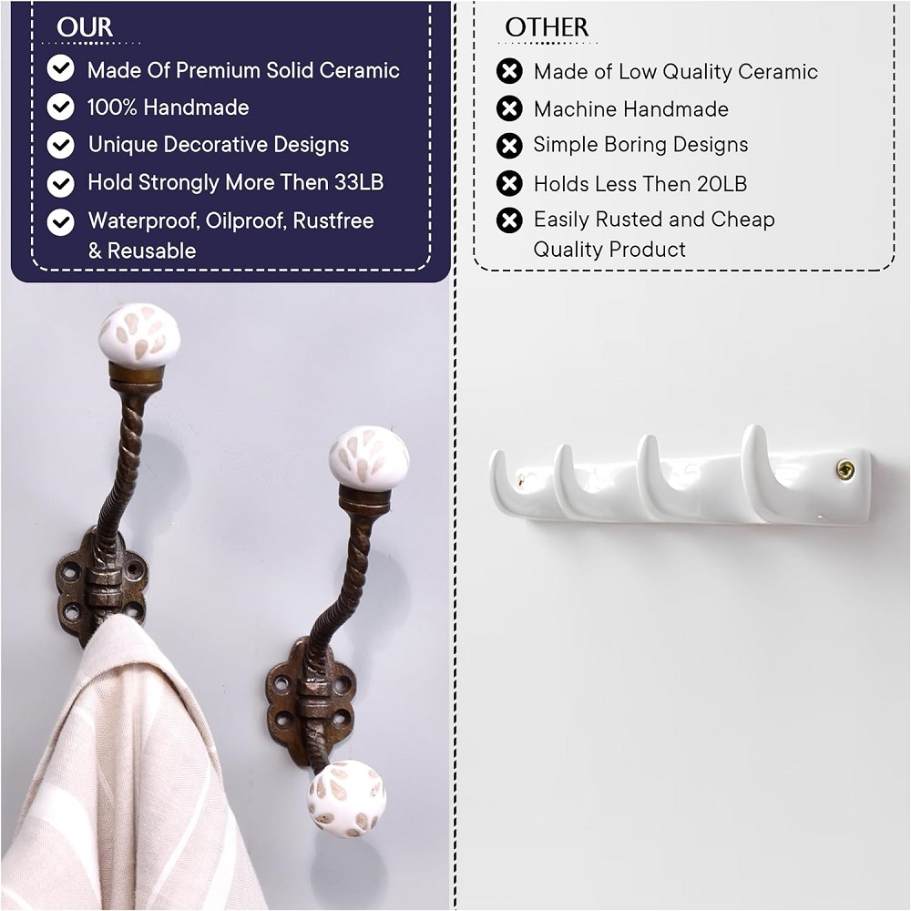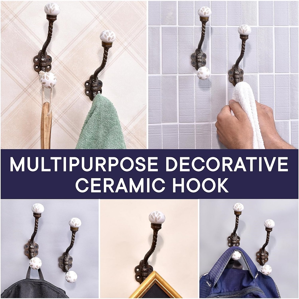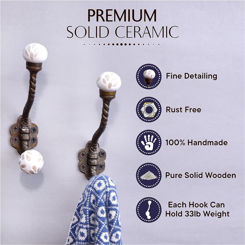 Coat Hooks Wall Mounted - Double Hooks for Hanging - Hooks for Hanging Coats -White Double Wall Hooks - Double Hook - Double Coat Hooks - Wall Hooks - Ceramic Wall Hooks - White Coat Hooks - 2 Pack