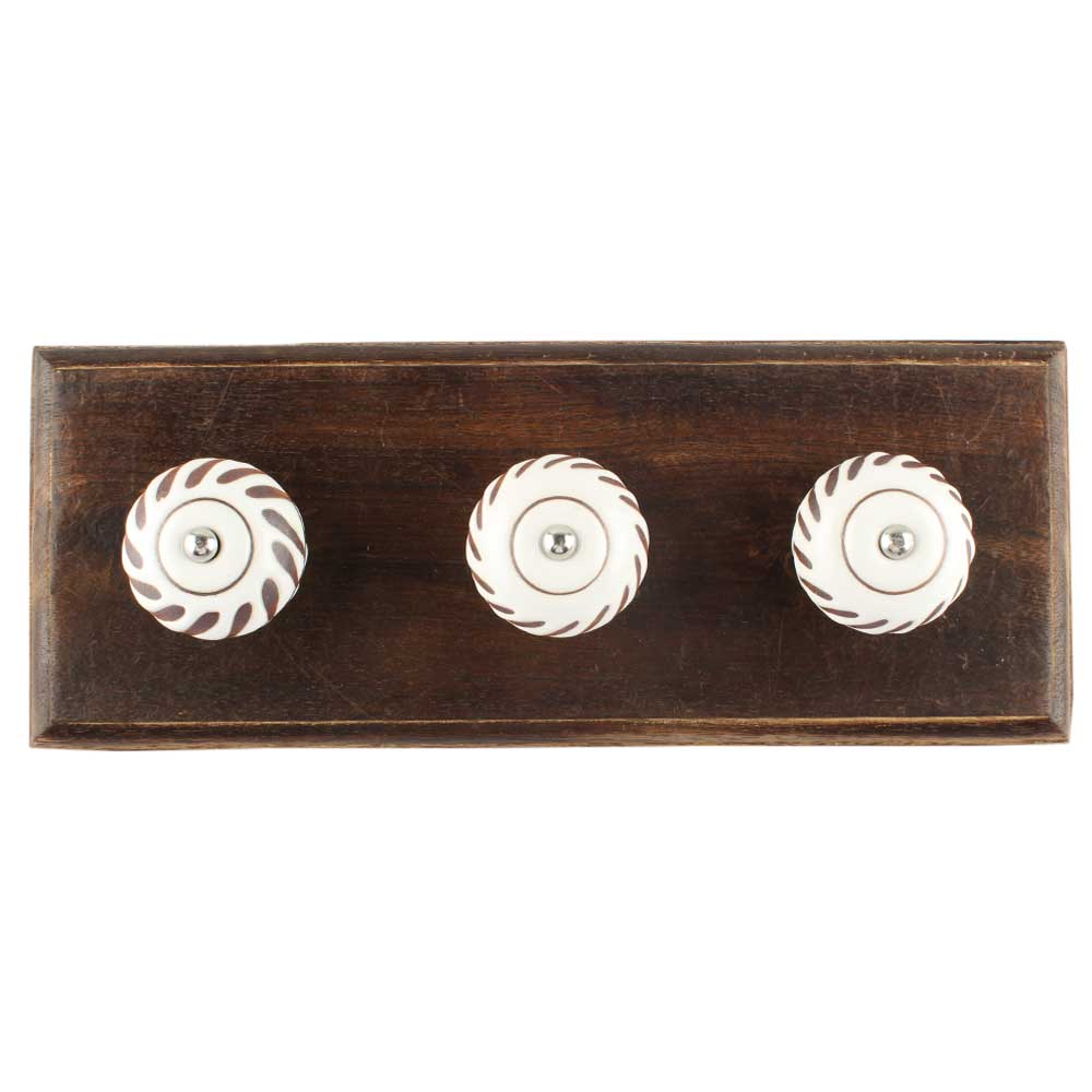 White Etched Ceramic Floral Wooden Hooks. A Perfect Complement to the Soft Tone of the Wood are these White Traditional Hat and Coat Hook Made of Genuine Porcelain and Brass. It can be used to Hang Jewelry, Leashes, Towels, Scarves, Light Weight Sweaters, Caps etc.