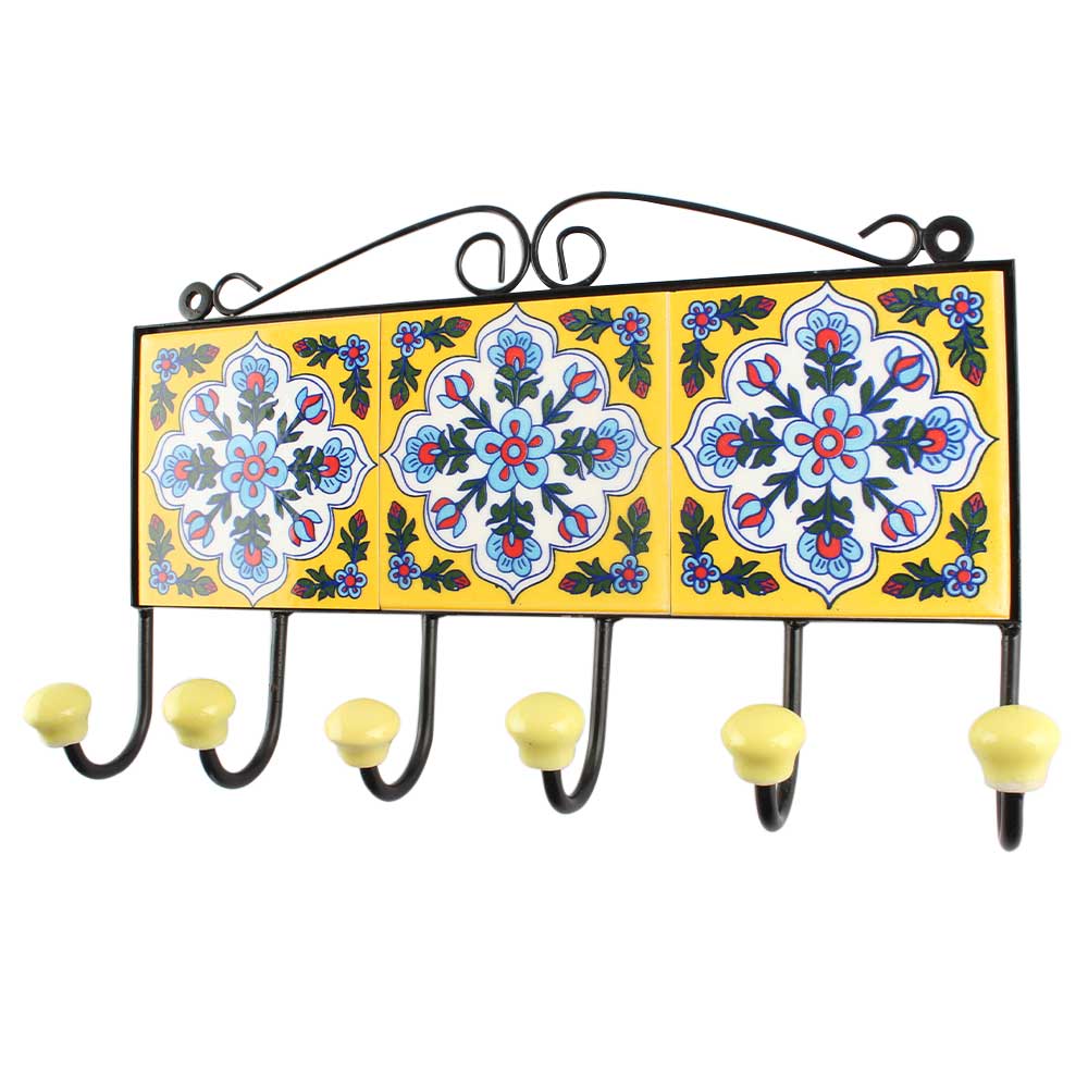 White Floral Ceramic Tile Hook. When Put on Wall or Cabinet It is An Art in Itself. The Metal Part of this Hook is Black Powder Coated.