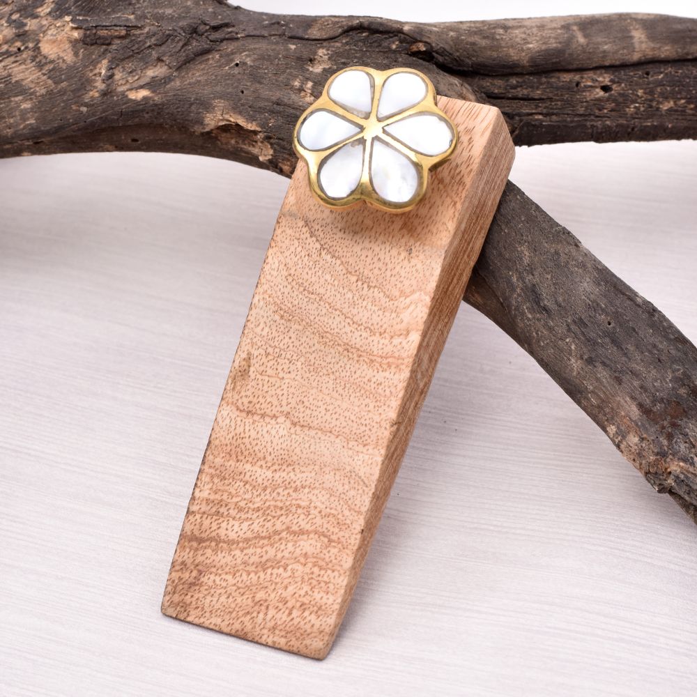 This Wooden Door Stopper is a perfect fusion of elegance and functionality. Crafted from high-quality wood and adorned with an antique brown finish, this door stopper is a true testament to timeless craftsmanship. Handmade by highly skilled Indian artisans, each piece showcases their meticulous attention to detail. Adding a touch of grace, a delicate flower crafted from lustrous white mother of pearl embellishes the door stopper. Its iridescent beauty captivates the eye, making it a delightful addition to any home decor. Furthermore, a rubber grip discreetly placed beneath ensures the door stopper remains securely in place, preventing slips and slides. This elegant accessory serves as an ideal gift for your loved ones on special occasions like housewarming. Combining functionality with exquisite aesthetics, the Wooden Door Stopper is a statement piece that effortlessly elevates the ambiance of any space.