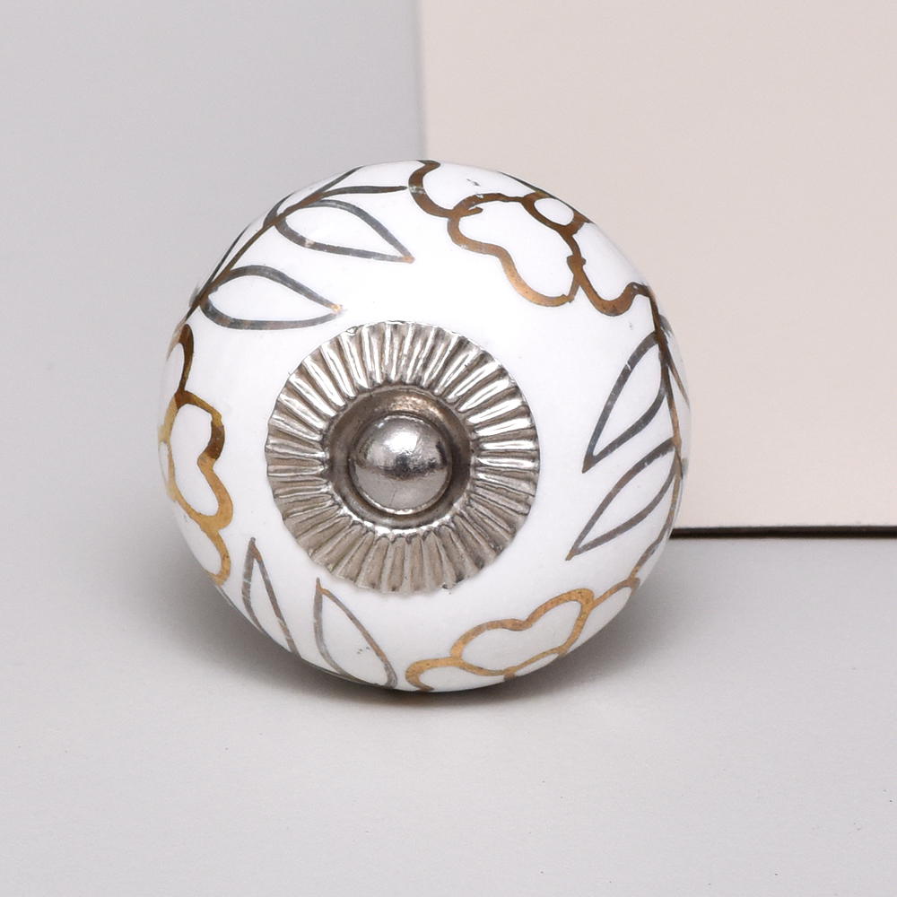 Elevate your furniture with the White Gold Fine Leaf Round Ceramic Cabinet Knob. This beautiful knob features a white ceramic base embellished with delicate gold leaf accents, striking a perfect balance between timeless elegance and contemporary style. It's an excellent choice for enhancing the appearance of cabinets, drawers, and dressers, making a bold statement in any space.