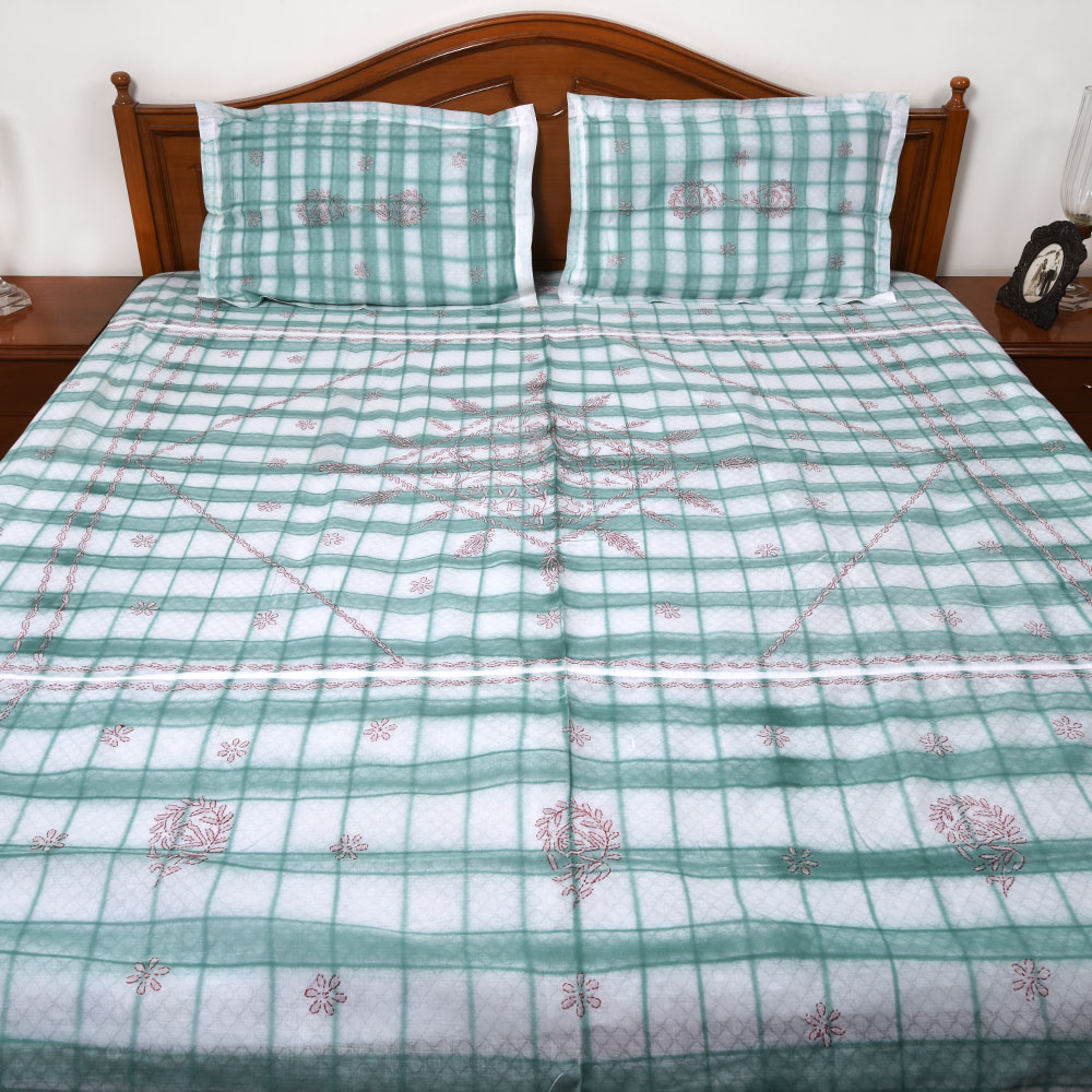 White- green cotton checkered double bed with pink chikankari design. Hand crafted supporting eye capturing designs and colours.