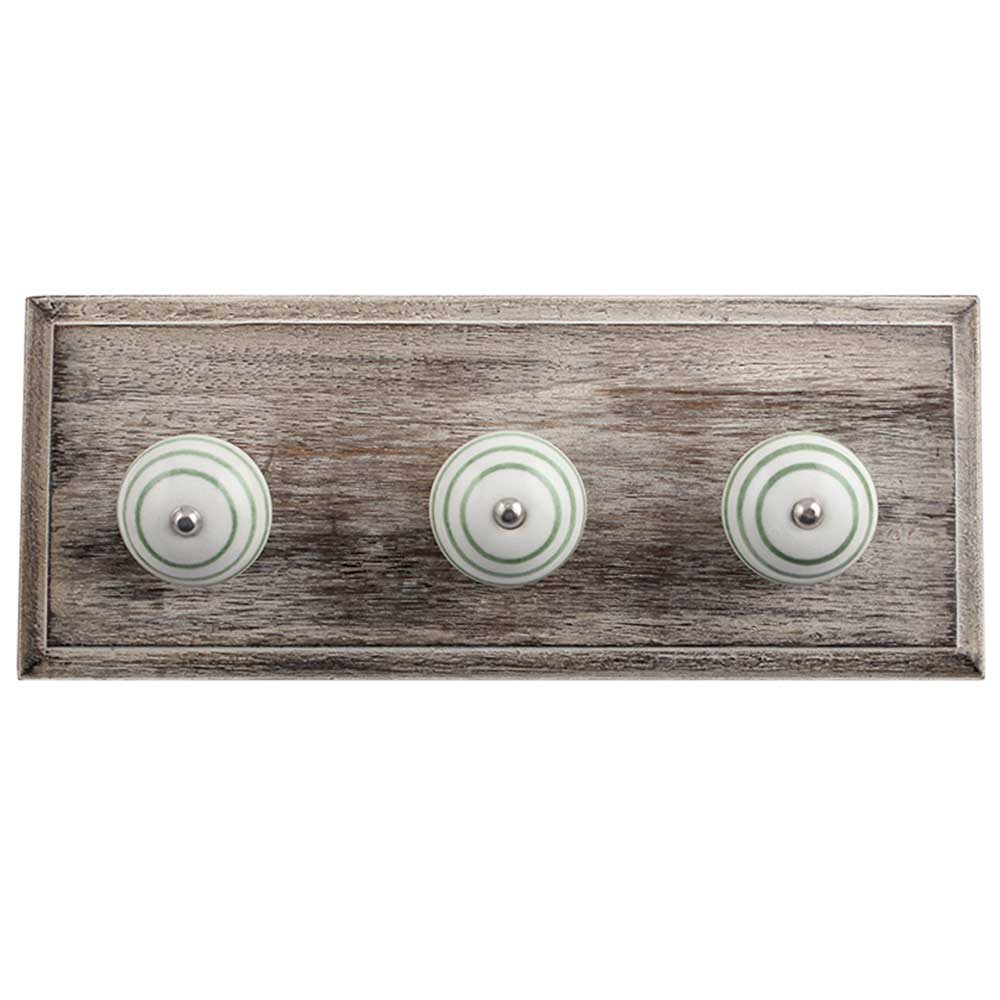 White Pea Green Strip Wooden Hooks. A Perfect Complement to the Soft Tone of the Wood are these White Traditional Hat &Amp; Coat Hook Made of Genuine Porcelain and Brass. It can be use to Hang Jewellery, Leashes, Towels, Scarves, Light Weight Sweaters, Caps Etc.
