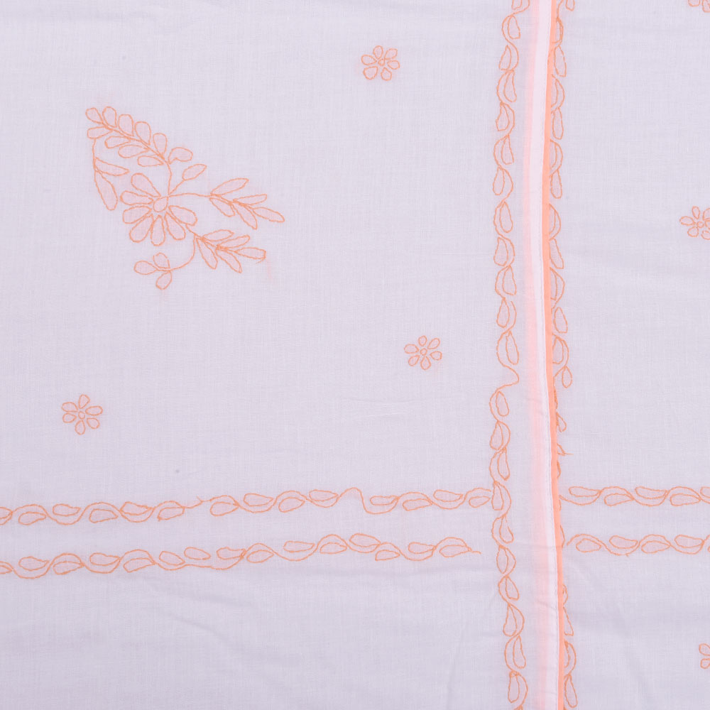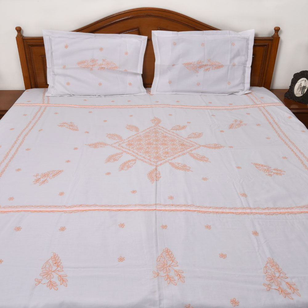 White-Peach Chikankari Embroidered Cotton bed sheet. Hand crafted supporting eye capturing designs and colours.