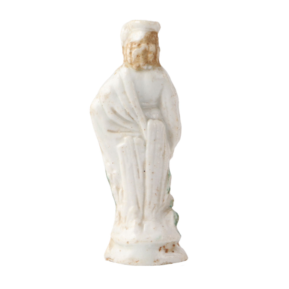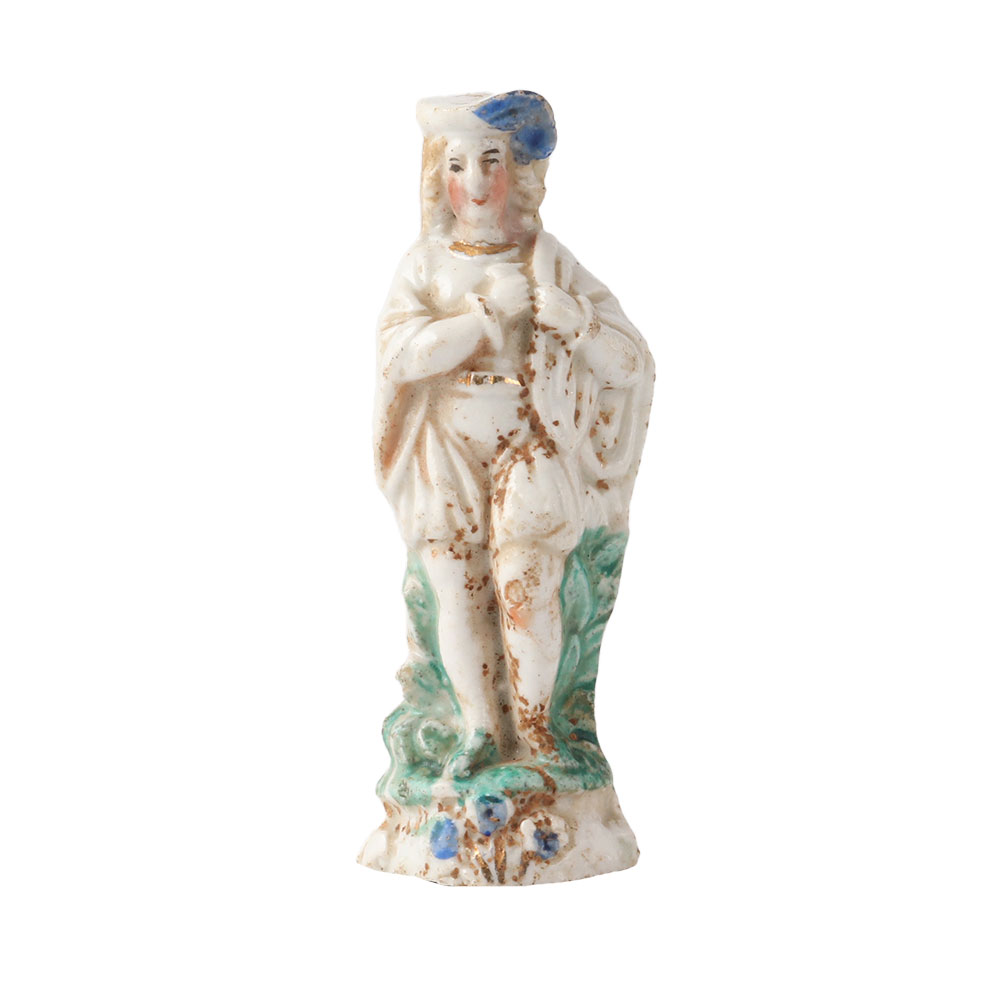 This is a rare porcelain figurines made of earthenware for mantel decor. The earliest figures that can be dated seem to be those of Queen Victoria. But when they were at their peak, they were mass-produced and frequently based on prints. They covered a wide range of topics, but those of actors and actresses were particularly well-liked. A man in costume figurine. He is dressed in breeches, a blue cape, shoes, and a white shirt with puffy sleeves. Use it as decor or a gift for family and friends.