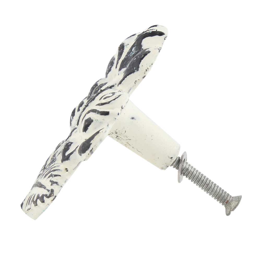 The White Rose with Branch Distressed Iron Dresser Knob features a beautifully detailed white rose paired with a branch design. The soft, elegant white color and intricate detailing bring a natural, classic look to any furniture piece.