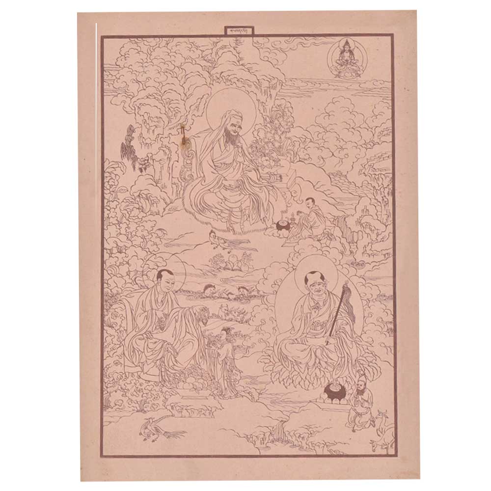 An old buddha painting made on beige showiing the life an stages of gautam buddha .It is a very old painting probably made by hand and the beauty of the image is no place is empty and the entire frame is filled with landscsape beauty and scenes.
