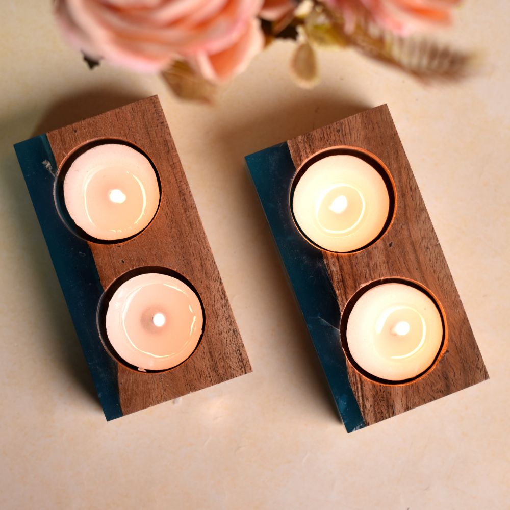 Wood and Epoxy Translucent Aqua Tea-Light Holder is a stunning and functional piece that will add warmth and elegance to any home decor. Its high-quality materials and unique design make it a perfect choice to create a cosy and inviting atmosphere in their home. It is a beautiful and unique addition to any home decor. The candle holder is wooden with translucent aqua epoxy, which gives it a stunning and modern look. The tea-light holder can hold two candles, creating a warm and inviting atmosphere. The translucent aqua epoxy adds a pop of colour and elegance to the natural wood, creating a beautiful and unique design that is both modern and timeless. The Wood and Epoxy Translucent Aqua Tea-Light Holder is perfect for any occasion, whether a romantic dinner for two or a relaxing night in. The soft glow of the candles and the beautiful translucent aqua epoxy design will create a calming and peaceful atmosphere. This candle holder is also an excellent gift for friends and family who appreciate the unique and stylish home decor. It is perfect for those who love natural and rustic, combined with modern design.