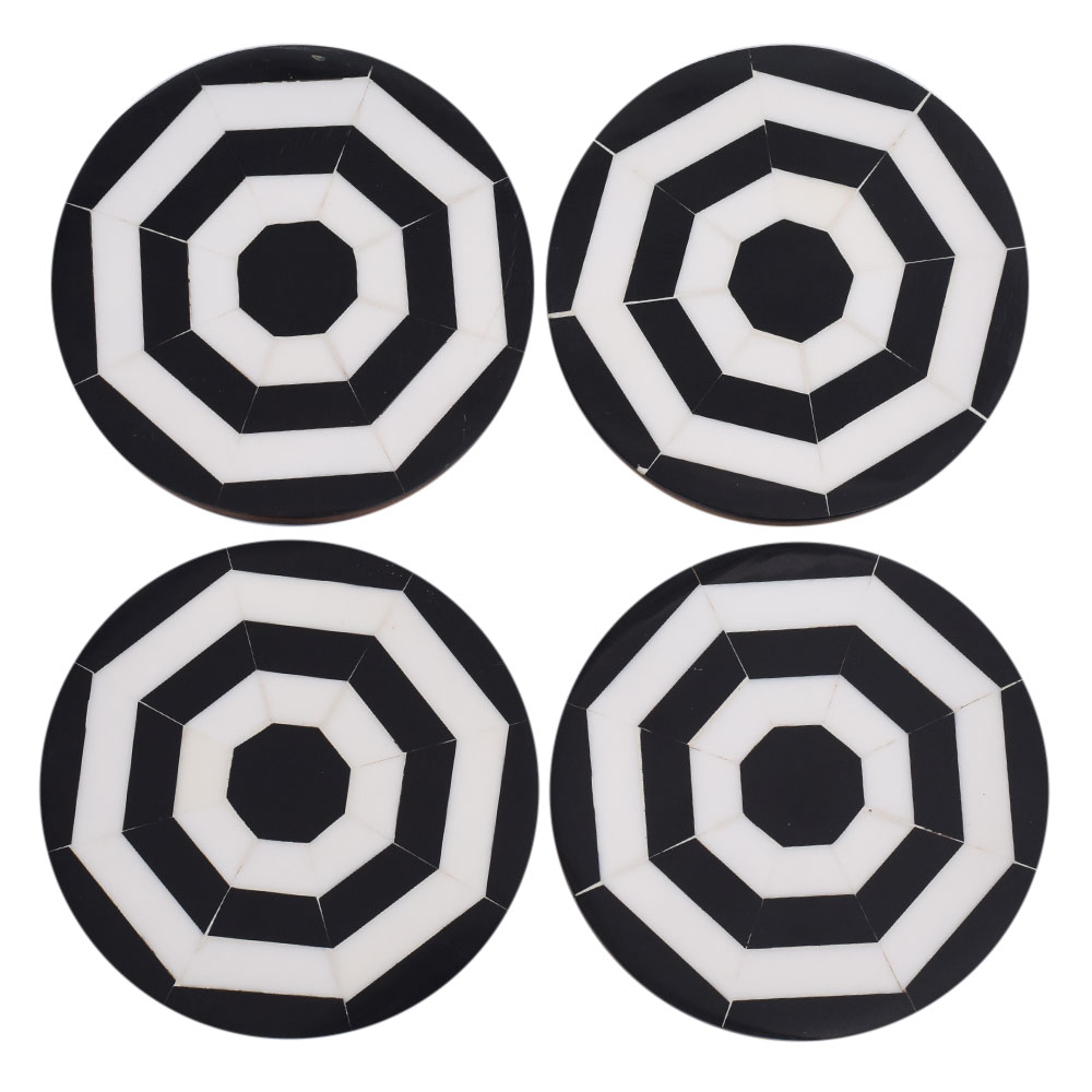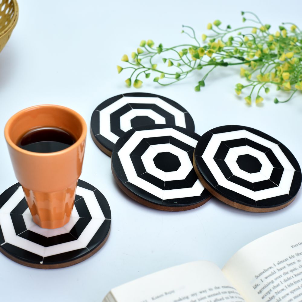 These exclusive round black and white pattern coasters made of wood and resin will add a beautiful touch to your table. The coasters are small table accessories that add a touch of indian eloquence to your desk, table, workspace, and countertops by keeping them clean and dry. Ideal for use at home, bars, restaurants, bars, coffee shops, companies, offices, education institutions, religious institutions, special occasions, catering, events, and daily use.