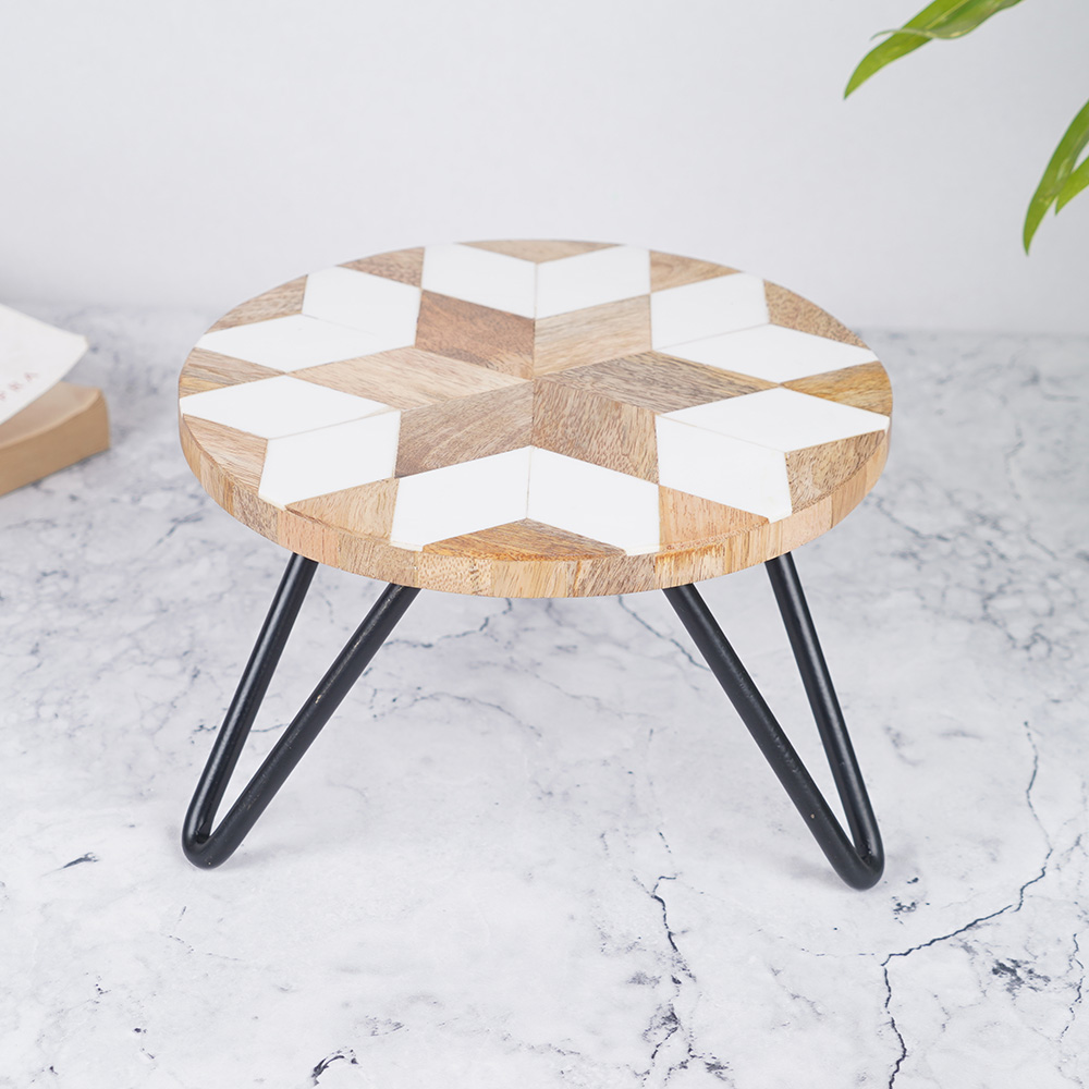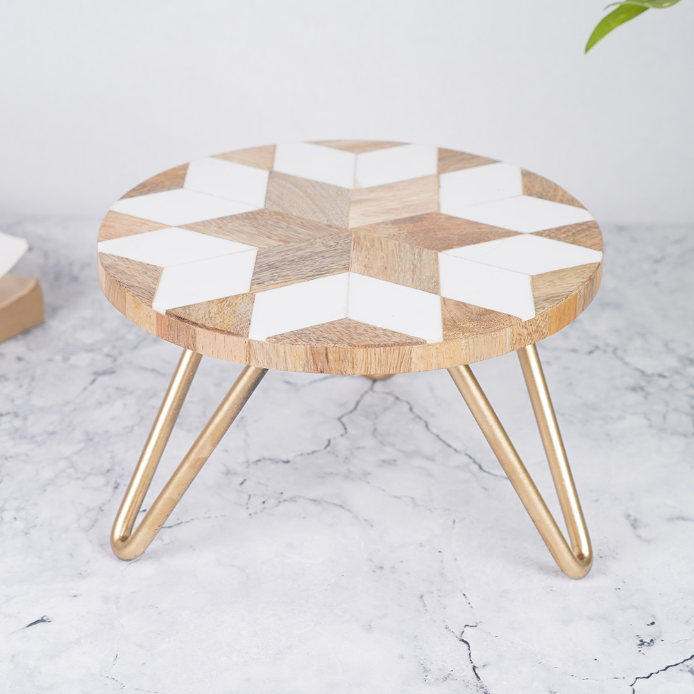 Introducing the stunning wood and resin cake stand, beautifully handcrafted by professional Indian artisans. This exquisite cake stand boasts an intricate star pattern in rich brown and white hues, adding a touch of elegance to any occasion. Perfect for birthdays, anniversaries, weddings, and other special events, this stand is versatile and can be used in restaurants, hotels, or at home. Crafted from high-quality wood and resin, this cake stand is sturdy and durable, ensuring your delicious confections are presented with the utmost care. The stand is available with a black and golden iron base, adding a touch of sophistication to its already impressive design. This handmade cake stand is not only a stunning addition to any celebration but also makes for a thoughtful gift for your loved ones. Whether you're a professional baker, a home cook, or simply love to entertain, this wood cake stand is the perfect way to showcase your culinary creations. Invest in this exquisite wedding cake stand and elevate your dessert presentation to a whole new level.