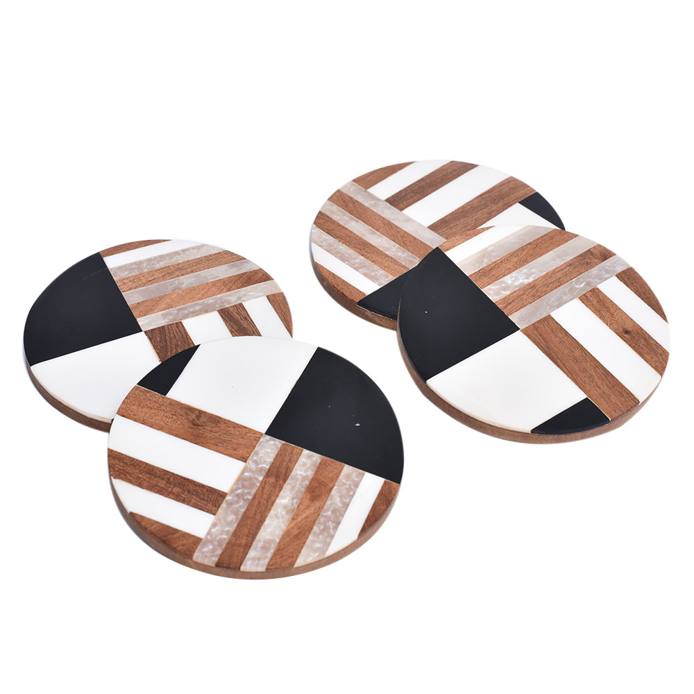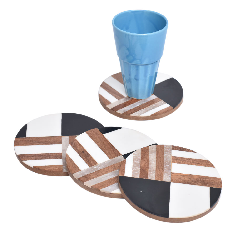 Handmade beautifully patterned geometric coasters highlights an eye-catching geometric wooden design while safeguarding your surfaces from heat and moisture. Your drinks will have never looked better. These coasters are made with wood and resin. Coaster sets of four are available. Ideal for use as a table decoration at home, hotels, and resorts.