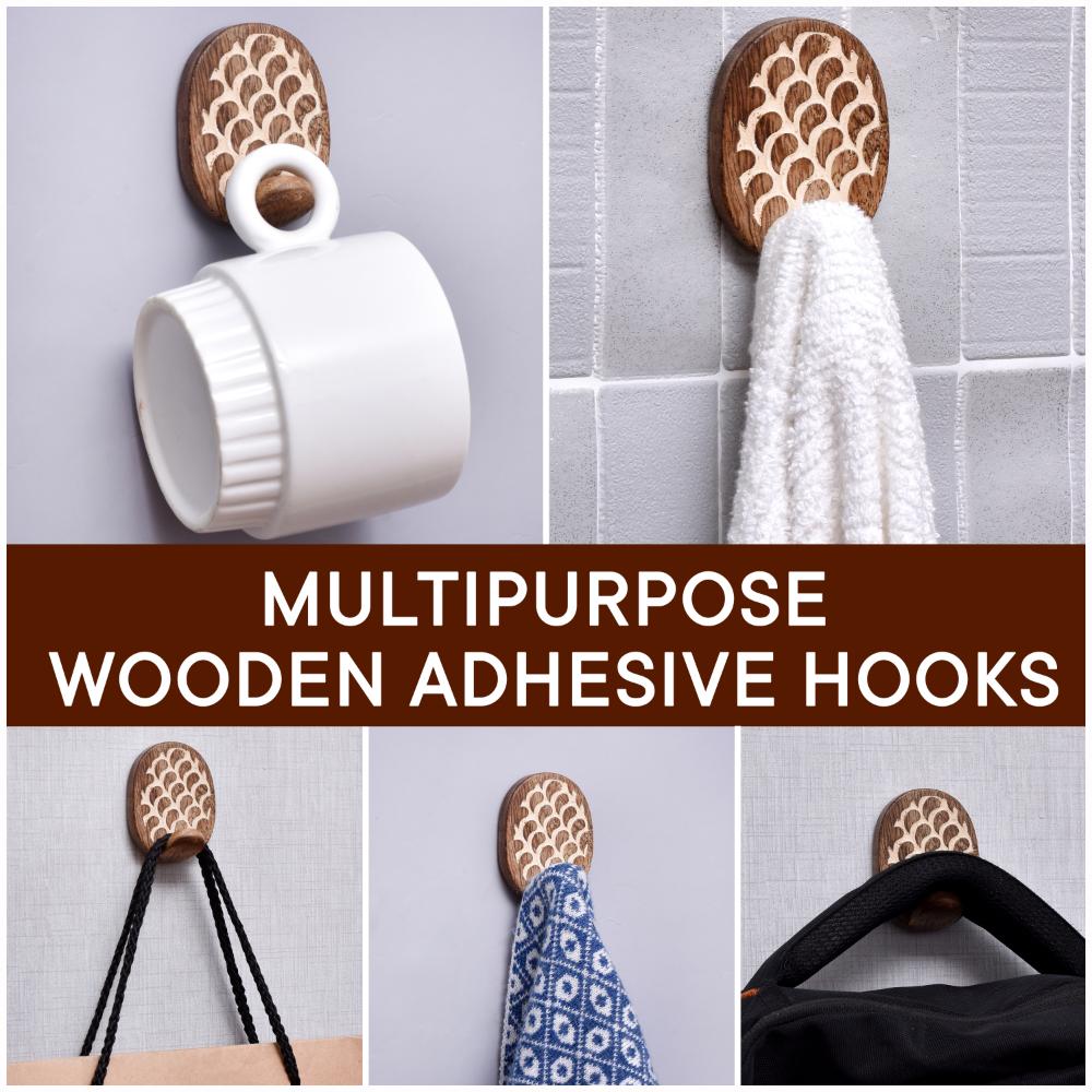 Material: Brown Premium Wood Finish: Natural brown wood-look base with glossy white hook Installation: Self-adhesive backing—tool-free and damage-free
