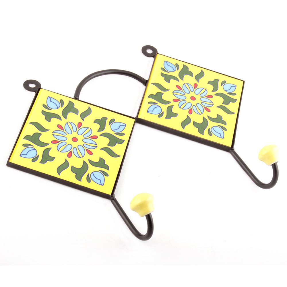 Yellow And Forest Green Ceramic Floral Tiles Hooks. When Put on Wall or Cabinet it is an Art in itself. The Metal Part of this Hook is Black Powder Coated.