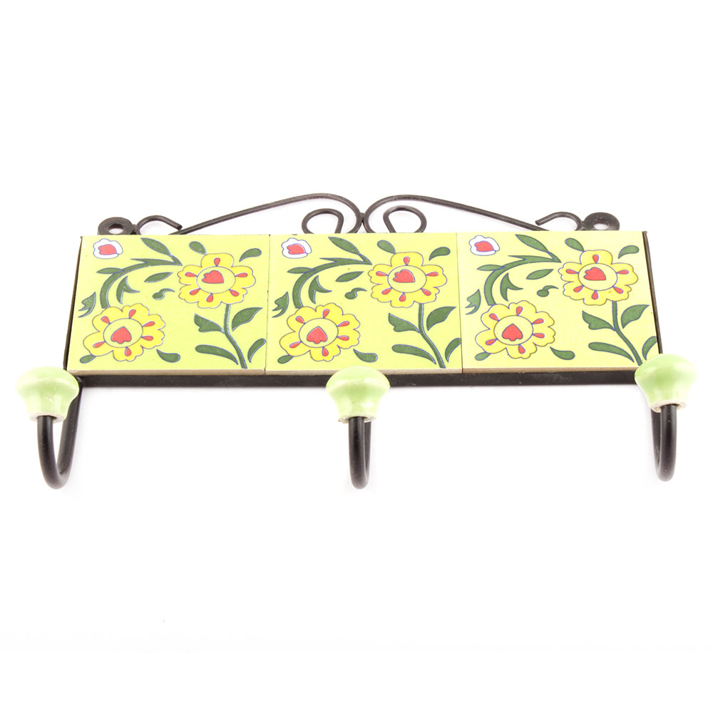Yellow And Forest Green Leaf Floral Tiles Hooks Online. When Put on Wall or Cabinet it is an Art in itself. The Metal Part of this Hook is Black Powder Coated.