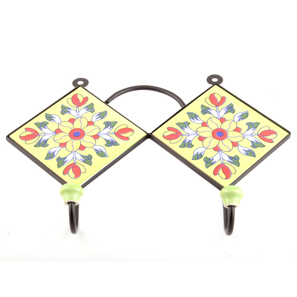 Yellow And Red Ceramic Floral Tilse Hooks. When Put on Wall or Cabinet it is an Art in itself. The Metal Part of this Hook is Black Powder Coated.