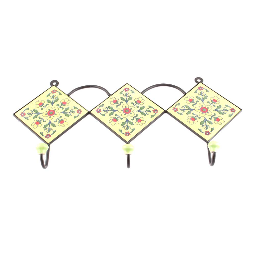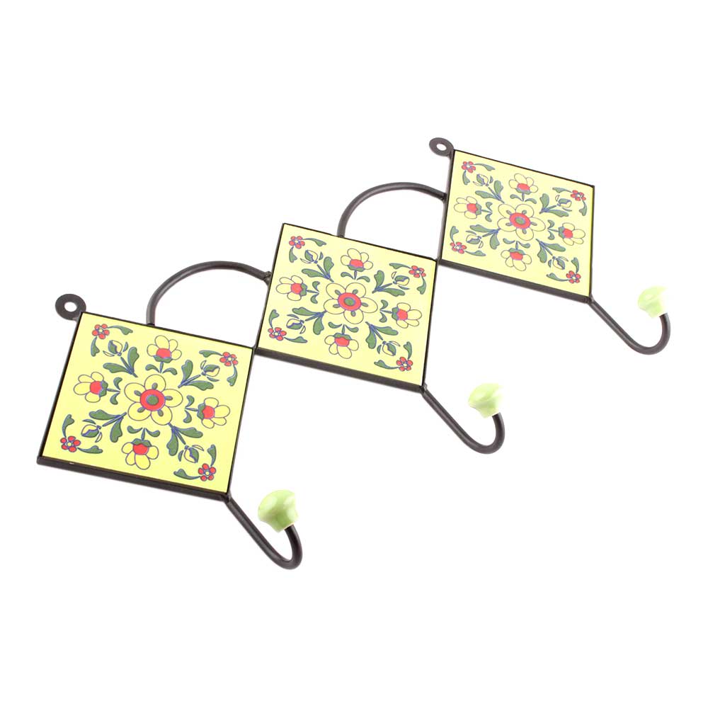 Yellow And Red Tiny Flower Tiles Hooks. When Put on Wall or Cabinet it is an Art in itself. The Metal Part of this Hook is Black Powder Coated.