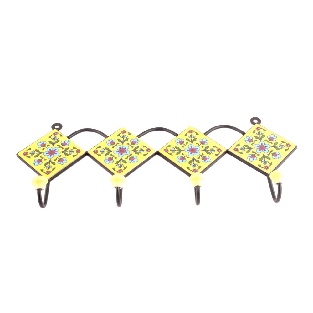 Yellow And Turquoise Tiny Flower Ceramic Tiles Hooks. When Put on Wall or Cabinet It is An Art in Itself. The Metal Part of this Hook is Black Powder Coated.